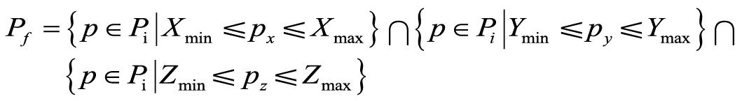 点云直通滤波是一种被广泛采纳的点云处理方式,旨在清除不相关区域和噪声,同时保留感兴趣区域内的关键点云信息[15-16]。其基本原理包括指定特定维度(如Z轴)、设定数值范围(如[Xmin, Xmax])并遍历点云中的每个点,检查其指定维度上的数值是否在设定范围内。直通滤波保留的点云集合如公式(6)所示: