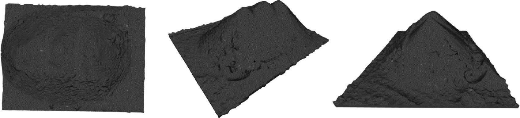 本研究对上采样后的料堆点云数据进行了曲面重建,采用了基于alpha shape算法的方法。该算法能有效从点云数据中提取曲面信息,生成平滑且连续的三维模型,准确描述料堆的几何形状。实验验证表明,该方法生成的曲面模型在保持料堆特征的同时,更为连续和规整,较好地反映了料堆的真实形态。这一曲面重建方法为料堆三维建模提供了可靠的数据基础,展现出了在点云数据处理中的实用性和有效性。曲面重建效果如图 8所示。通过对全部小四面体体积进行累加,得到该料堆的理论体积为52.13 m3。在仓库现场,采用称重法测量其质量,并换算得到该料堆的实际体积为51.44 m3,相对误差为1.32%。