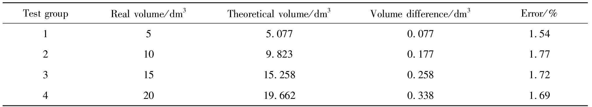 Test groupReal volume/dm3Theoretical volume/dm3Volume difference/dm3Error/%155.0770.0771.542109.8230.1771.7731515.2580.2581.7242019.6620.3381.69