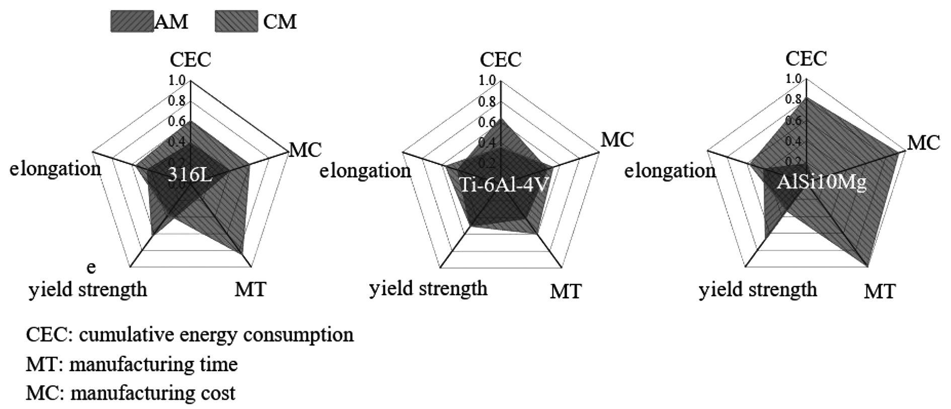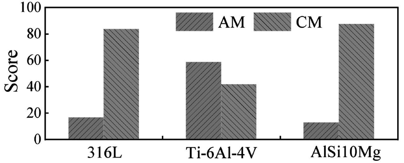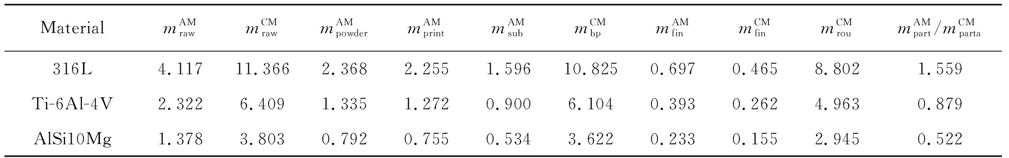 MaterialmAMrawmCMrawmAMpowdermAMprintmAMsubmCMbpmAMfinmCMfinmCMroumAMpart/mCMparta316L4.11711.3662.3682.2551.59610.8250.6970.4658.8021.559Ti-6Al-4V2.3226.4091.3351.2720.9006.1040.3930.2624.9630.879AlSi10Mg1.3783.8030.7920.7550.5343.6220.2330.1552.9450.522