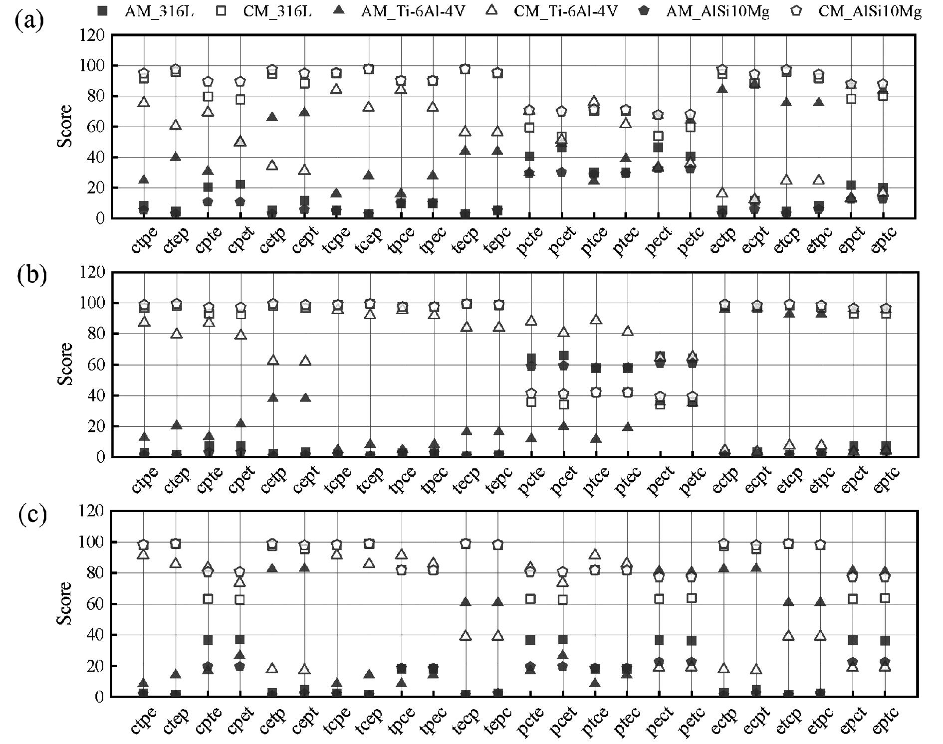 总体来看,本案例中3种材料的简化轴承座均更适合用传统减材制造工艺生产,尤其是AlSi10Mg铝合金材料,除了屈服强度占优之外,增材制造在累积能耗、制造时间、制造成本等指标中均大幅度高于传统减材制造(图6),从而导致传统减材制造的评估分值在多数权重组合下均高于传统减材制造。然而,在特别注重零件性能的条件下(如航空航天零件),如图8(b)的“pcte”组合,性能的权重比值达到了0.825,此时增材制造的评估分值高于传统减材制造,表明此种权重分配下增材制造工艺路线更优。