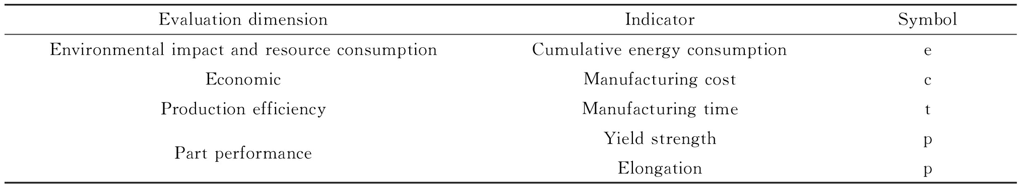 在绿色制造背景下,产品加工工艺路线的决策不仅要考虑经济、产品性能和生产效率,还应该考虑环境影响和资源消耗。本文采用累积能耗指标综合表征制造过程对环境和资源消耗的影响,其定义为零件的材料生产能耗与制造过程所消耗的电能、辅助材料(如切削刀具、切削液、保护气体等)蕴含能之和[17];经济维度的指标为制造成本,包括材料成本、电能成本、人工成本等(由于制造设备为固定资产,不受工艺过程中工艺参数的影响,因此本文未考虑设备成本);性能维度选用屈服强度与延伸率为评估指标;生产效率维度选用制造时间为评估指标,如表1所示。