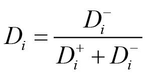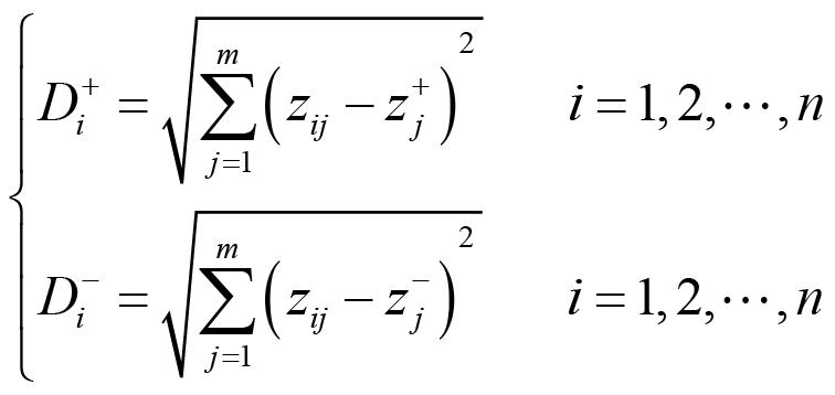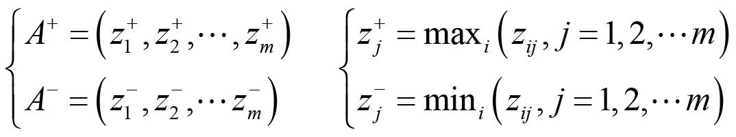 在n个评估对象中,评估指标的正理想解和负理想解分别为: