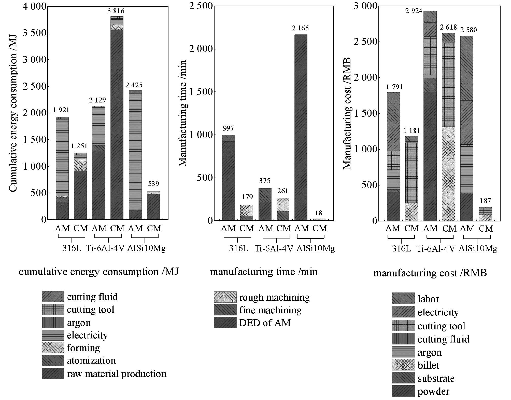利用建立的参数化累积能耗模型、制造时间模型以及制造成本模型,可有效地针对某一道工序或整个加工过程的指标数据进行估算,并获悉不同材料、不同制造工艺对各指标的影响。图5展示了增材制造工艺与传统减材制造工艺生产同一简化航空轴承座时所耗费的能源、时间、成本情况。