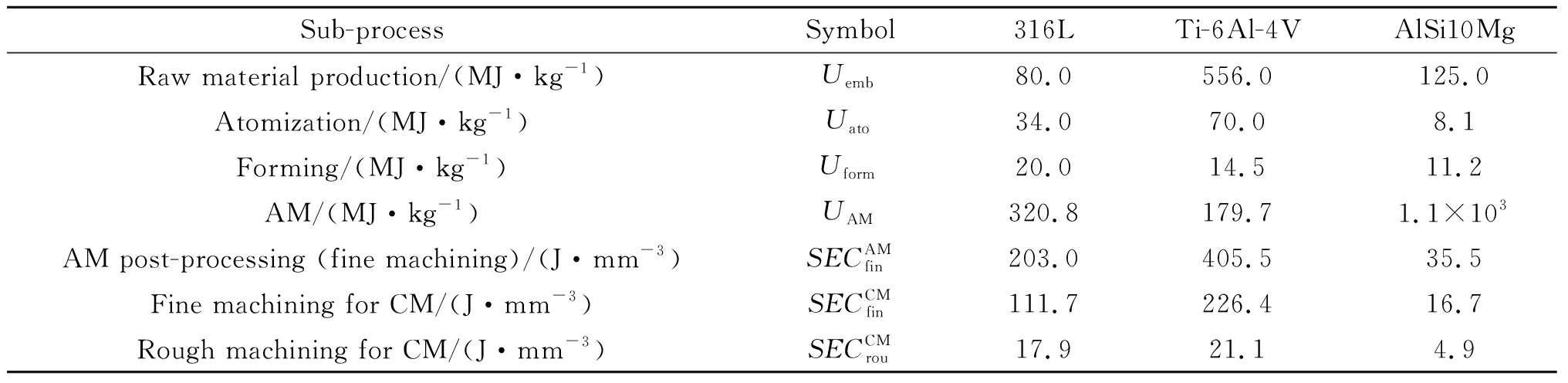 Sub-processSymbol316LTi-6Al-4VAlSi10MgRaw material production/(MJ·kg-1)Uemb80.0556.0125.0Atomization/(MJ·kg-1)Uato34.070.08.1Forming/(MJ·kg-1)Uform20.014.511.2AM/(MJ·kg-1)UAM320.8179.71.1×103AM post-processing (fine machining)/(J·mm-3)SECAMfin203.0405.535.5Fine machining for CM/(J·mm-3)SECCMfin111.7226.416.7Rough machining for CM/(J·mm-3)SECCMrou17.921.14.9