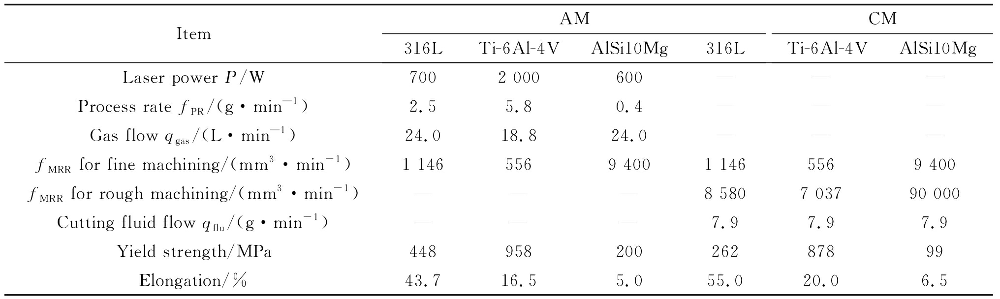 ItemAM316LTi-6Al-4VAlSi10Mg316LCMTi-6Al-4VAlSi10MgLaser power P/W7002 000600———Process rate fPR/(g·min—1)2.55.80.4———Gas flow qgas/(L·min—1)24.018.824.0———fMRR for fine machining/(mm3·min-1)1 1465569 4001 1465569 400fMRR for rough machining/(mm3·min-1)———8 5807 03790 000Cutting fluid flow qflu/(g·min-1)———7.97.97.9Yield strength/MPa44895820026287899Elongation/%43.716.55.055.020.06.5