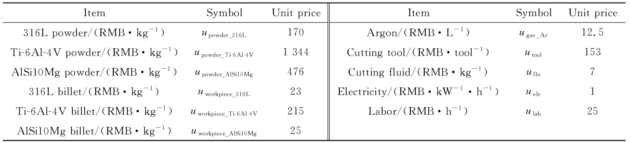 ItemSymbolUnit priceItemSymbolUnit price316L powder/(RMB·kg-1)upowder_316L170Argon/(RMB·L-1)ugas_Ar12.5Ti-6Al-4V powder/(RMB·kg-1)upowder_Ti-6Al-4V1 344Cutting tool/(RMB·tool-1)utool153AlSi10Mg powder/(RMB·kg-1)upowder_AlSi10Mg476Cutting fluid/(RMB·kg-1)uflu7316L billet/(RMB·kg-1)uworkpiece_316L23Electricity/(RMB·kW-1·h-1)uele1Ti-6Al-4V billet/(RMB·kg-1)uworkpiece_Ti-6Al-4V215Labor/(RMB·h-1)ulab25AlSi10Mg billet/(RMB·kg-1)uworkpiece_AlSi10Mg25