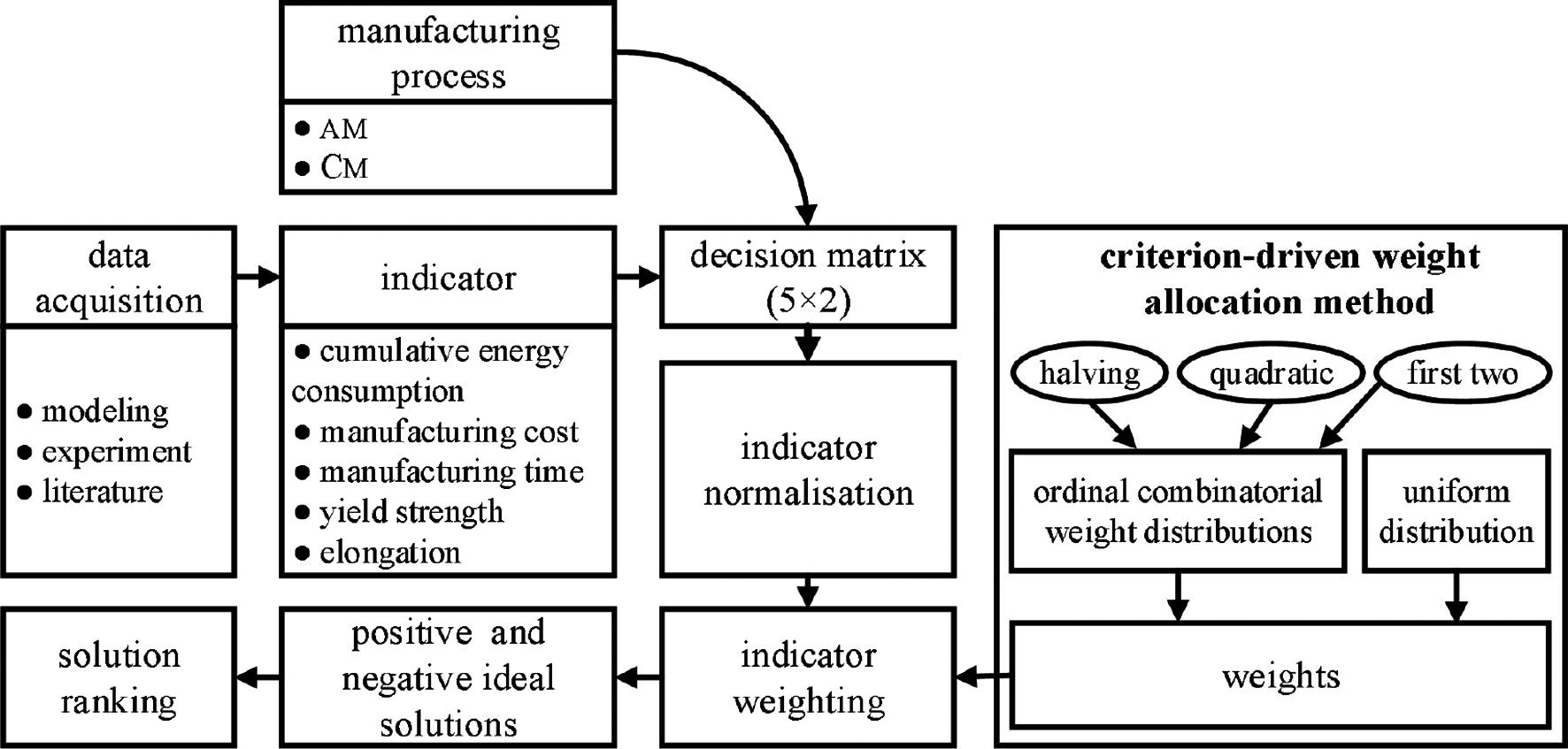综合考虑环境、经济、性能和生产效率4个维度的评估指标,本文提出了基于工艺过程的准则驱动权重分配TOPSIS多指标评估方法。基于零件制造过程材料流特性,分别构建了增材制造和传统减材制造工艺的累积能耗、制造成本、制造时间等指标的参数化模型。以某航空发动机简化轴承座为应用案例,研究了316L不锈钢、Ti-6Al-4V钛合金以及AlSi10Mg铝合金等3种常用金属材料对工艺路线决策的影响,验证了所提方法的适用性。案例研究表明,制造钛合金材料简化轴承座时,均分权重下增材制造工艺路线优于传统铣削减材制造。由多个准则驱动生成的决策映射空间既可以满足特定权重下的决策需求,又可以直观地表达决策方案对权重分配结果的敏感性。准则驱动权重分配TOPSIS多指标评估方法为实现绿色制造背景下增材制造产品加工工艺路线不确定性评估提供了理论支撑。