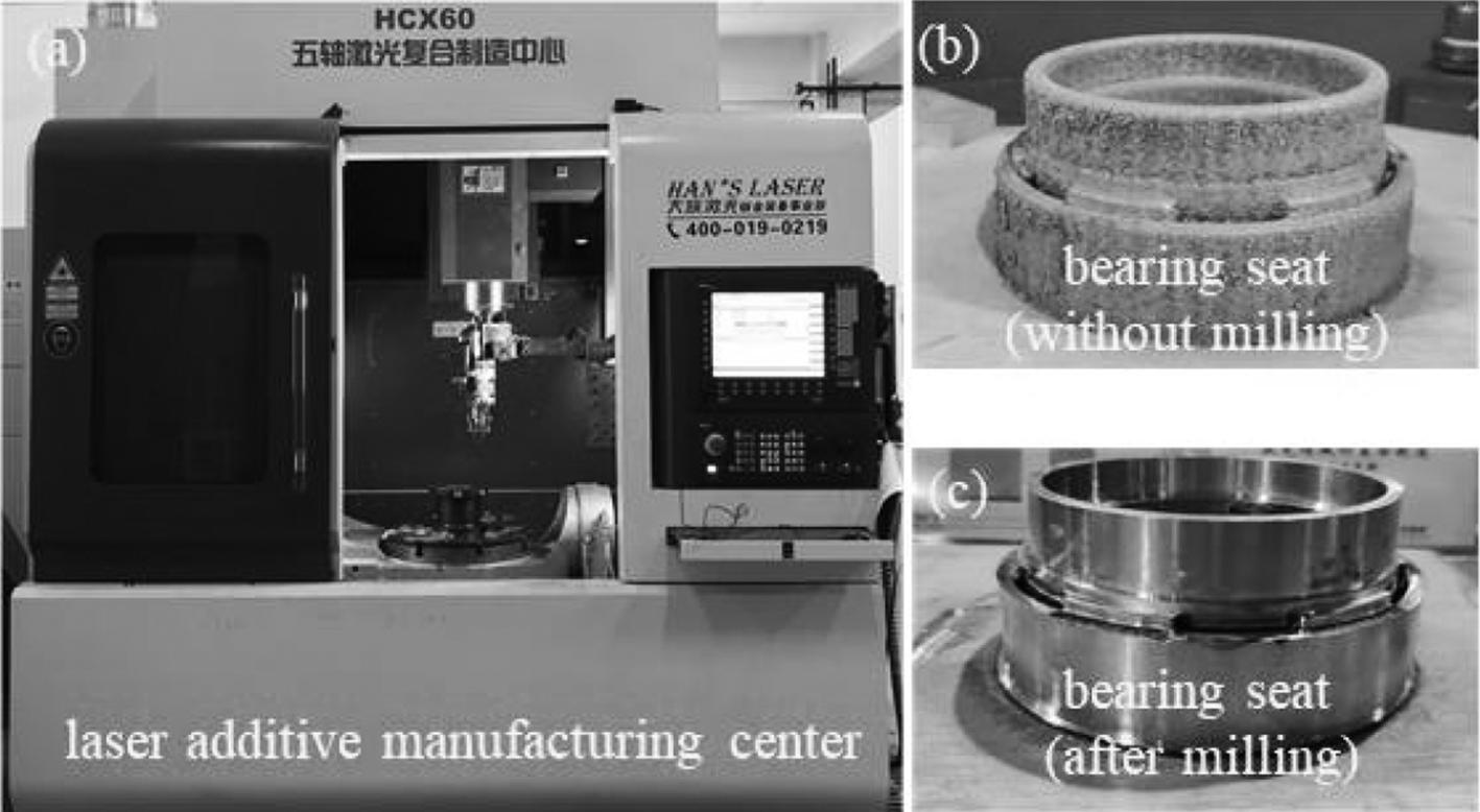 选取某航空发动机简化轴承座作为实验对象,利用HCX60五轴激光增减材复合制造中心完成其制造。该平台集成了激光直接能量沉积(laser directed energy deposition, LDED)增材工艺与五轴铣削减材工艺,可协同实现“打印-精加工”一体化连续制造过程,如图4(a)所示。图4(b)和图4(c)分别为打印后毛坯件及铣削后的最终零件。传统减材制造工艺选用Mori Seiki NMV 1500 DCG五轴铣削中心[18]。由于不同种类材料在制造阶段的能耗、效率、成本、性能具有显著差异,因此本文选用316L不锈钢、Ti-6Al-4V钛合金以及AlSi10Mg铝合金等3种常用材料作为研究变量,以探索材料类型对工艺路线决策的影响。表2为两种工艺路线制造3种材料的简化轴承座时在各个子工艺阶段的材料消耗。