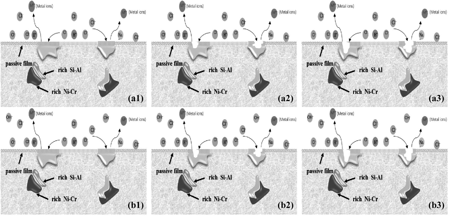 图9显示了AlCoCrFeNi2.1高熵合金在3.5%NaCl溶液和3.5%NaCl+0.01 mol/L NaOH溶液中的腐蚀机理,通过上个部分的分析可知,温度的改变只影响了腐蚀的程度,并不改变腐蚀的类型。根据电化学结果及表面氧化物检测分析,极化曲线中有明显的钝化区域,对应钝化膜结果分析可知,Al元素较为活泼,在Al元素的氧化膜中,氧化膜中的Al2O3含量较高,涂层最初的腐蚀是由溶液中的Cl-与涂层中的Al元素结合导致钝化膜被击穿。在3.5%NaCl+0.01 mol/L NaOH溶液中的电化学极化曲线显示随着温度升高,钝化区间变宽,且出现二次钝化行为,温度升高腐蚀速率加快,这与钝化膜分析结果相同,OH-浓度的增加减少了Cl-与Al元素的结合,抑制了涂层的腐蚀速率。由于腐蚀产物膜确实会提供一定的保护作用,但是其效果远远不如钝化膜[20]。图9(a1)~(a3)显示了AlCoCrFeNi2.1高熵合金在3.5%NaCl溶液中稳态和亚稳态的点蚀的成型过程,通过图3显示的极化曲线,AlCoCrFeNi2.1高熵合金产生了钝化的反应,但是Cl-破坏了钝化膜的完整性,同时也阻碍了钝化膜的自我修复,从而为点蚀发生提供了条件。图2中的背散射图显示,点蚀优先发生在富含Ni-Al的区域中,而在富Si-Al的区域中没有显示出明显的溶解。