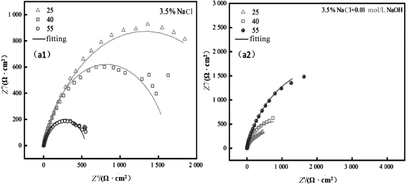 (a1)~(a3)3.5%NaCl中25~55 ℃;(b1)~(b3)3.5%NaCl+0.01 mol/L NaOH中25~55 ℃