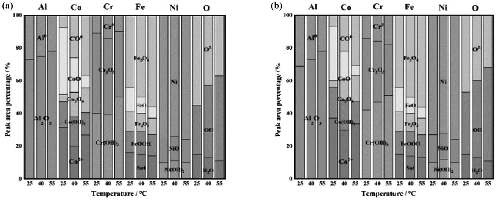 为了进一步阐明温度对于AlCoCrFeNi2.1高熵合金在3.5%NaCl溶液和3.5%NaCl+0.01 mol/L NaOH中钝化膜成分的影响,如图8所示为钝化膜中各元素峰强度随着温度改变所占的比例。随着温度的升高,Al2O3在3.5%NaCl溶液和3.5%NaCl+0.01 mol/L NaOH中产生的钝化膜中的比例逐步升高。在温度升高时,CoO和CO单质的含量均有下降趋势,其余形式的Co元素化合物的占比并未有明显变化。现有的研究表明,Co元素对于具有保护性的氧化膜并没有明显的影响。温度升高时,对钝化膜中的Cr元素也有影响,升高温度时钝化膜中的Cr2O3所占的比例降低了[19]。以往的研究表明,Cr2O3对于钝化膜的致密性是有积极影响的,所以温度的升高后Cr2O3的占比降低,意味着钝化膜的致密性受到影响。此外,通过比例图可知,温度的改变对于Fe元素的影响是比较小的,Fe元素的氧化物与氢氧化物的占比均发生明显的变化。此外,Ni元素在各个温度的占比并未发生明显的改变,并且尚未有研究表明温度对AlCoCrFeNi2.1高熵合金钝化膜中的Ni含量具有明显影响。已有的研究表明,在金属表面的钝化膜中,氧化物和氢氧化物的比例升高对于钝化膜具有较好的保护作用。温度的下降对合金在3.5%NaCl+0.01 mol/L NaOH溶液中的Al2O3钝化膜影响较小。随着温度的升高,Cr(OH)3的含量增加,与此同时Fe和Co的氧化物含量不变。此外,合金涂层钝化膜中的氢氧化物的含量(60%)是远高于氧化物含量(20%~30%)的,这说明了温度的升高导致氢氧化物和氧化物的比例减小,意味着合金涂层耐蚀性降低。以上结果表明,AlCoCrFeNi2.1高熵合金在3.5%NaCl溶液中形成的钝化膜比较稀疏,并没有像在3.5%NaCl+0.01 mol/L NaOH溶液中形成的钝化膜那么致密,且没有很好的阻隔腐蚀介质的效果。