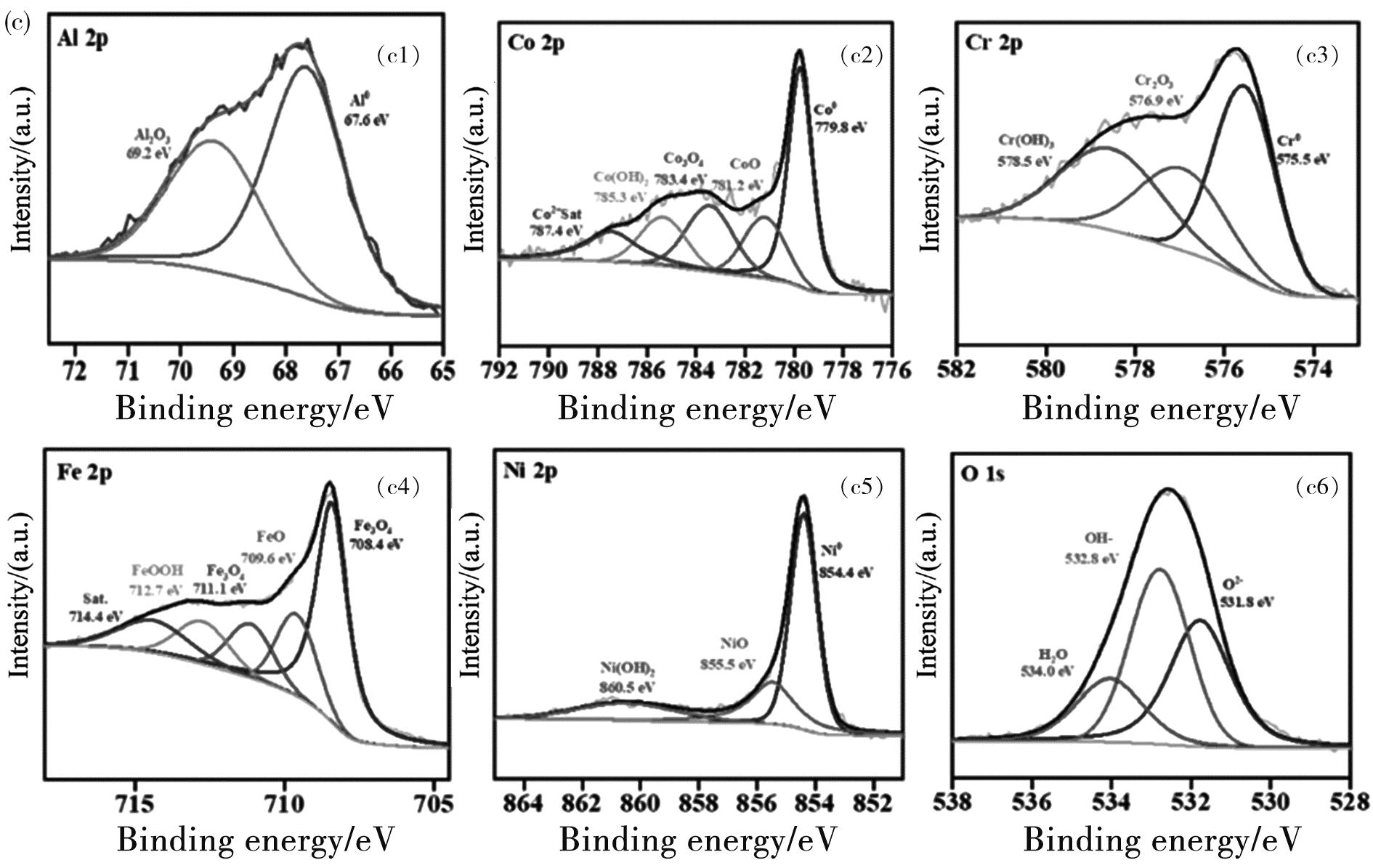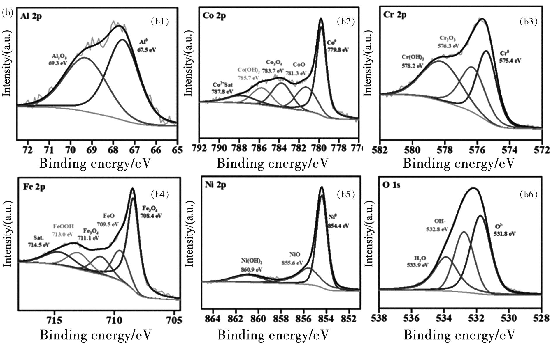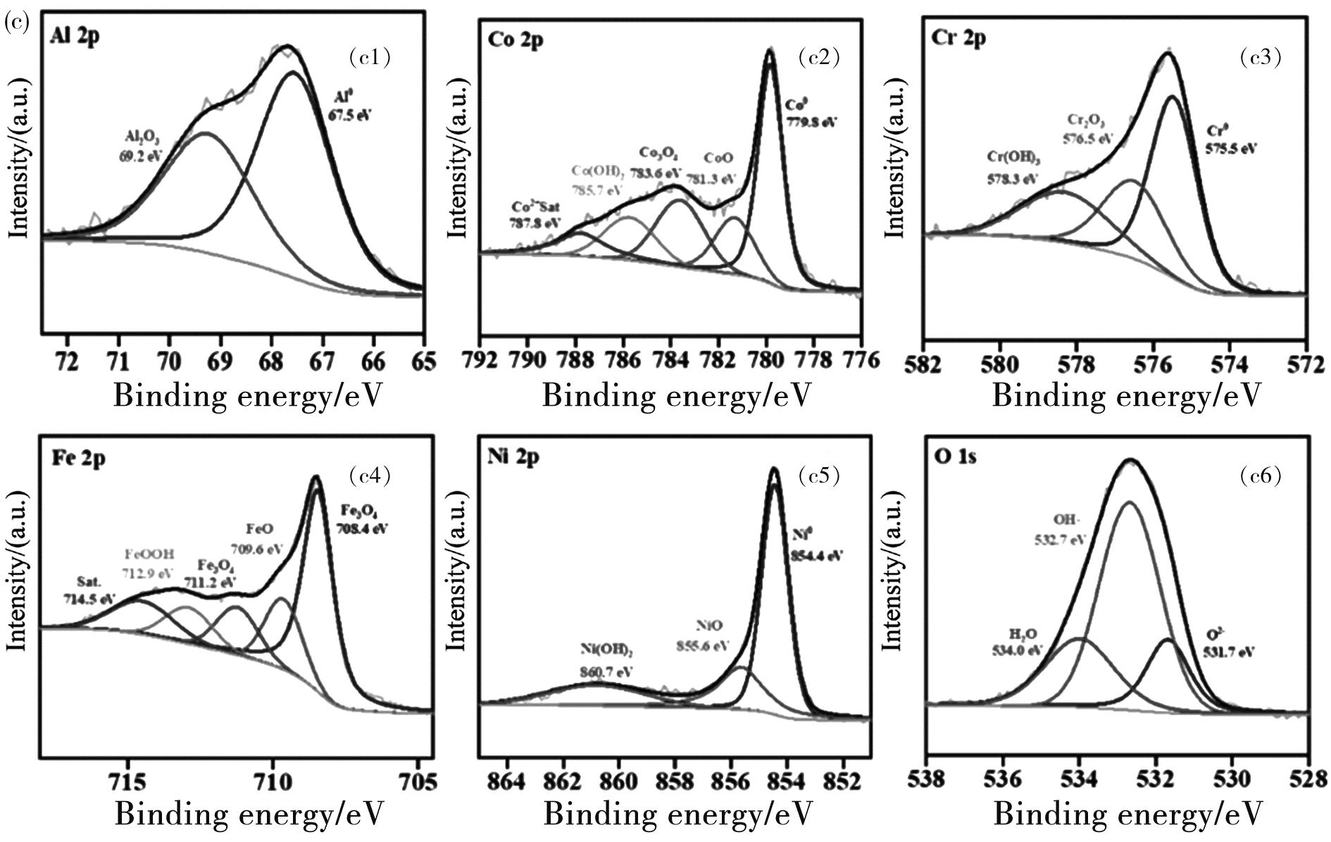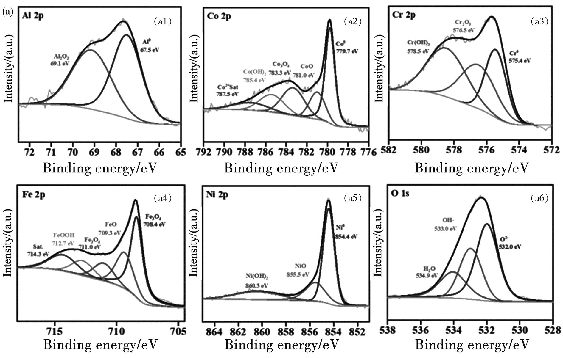 图6(a)~(c)和图7(a)~(c)分别显示了AlCoCrFeNi2.1高熵合金在不同温度下3.5%NaCl溶液中的XPS钝化膜分析结果。此外,图6(a)~(c)和图7(a)~(c)分别显示了AlCoCrFeNi2.1高熵合金不同温度下的3.5%NaCl溶液和3.5%NaCl+0.01 mol/L NaOH溶液中的XPS钝化膜分析结果。图6(a1)~(c1)和图7(a1)~(c1)显示的是AlCoCrFeNi2.1高熵合金在不同温度的3.5%NaCl溶液和3.5%NaCl+0.01 mol/L NaOH溶液钝化膜中的Al2p,其中包含了Al峰和Al2O3,峰值所占的面积代表元素在钝化膜中的含量,在3.5%NaCl溶液中,温度的改变对于Al峰的影响非常小,但是在3.5%NaCl+0.01 mol/L NaOH溶液中,Al峰随着温度的升高而增加。如图6(a2)~(c2)和图7(a2)~(c2)显示了Co 2p3/2的XPS数据,Co 2p3/2峰数据分为五个部分,分别是Co、CoO、Co3O4、Co(OH)2以及Co单质。在3个温度(25 ℃、40 ℃、55 ℃)梯度的3.5%NaCl溶液和3.5%NaCl+0.01 mol/L NaOH溶液中,Co主要以单质的形式出现,归其原因是由于Co元素具有较好的高温耐蚀性。如图6(a3)~(c3)和图7(a3)~(c3)所示,Cr 2p3/2分为了3个峰,分别是单质Cr、Cr2O3以及Cr(OH)3。由图6(a3)~(c3)可以看出,在3.5%NaCl溶液中,随着温度的升高,Cr2O3的峰值强度在降低,表明温度会影响钝化膜中Cr的种类。由之前的一些学者的研究可知,Cr2O3会在合金表面形成稳定且致密的氧化膜。这也是AlCoCrFeNi2.1高熵合金在不同温度的3.5%NaCl溶液中钝化膜表现差异化的原因之一。在3.5%NaCl+0.01 mol/L NaOH溶液中,Cr以单质Cr、Cr2O3以及Cr(OH)3的形式出现,随着温度的升高,钝化膜中Cr单质的含量升高,与此同时Cr氢氧化物在钝化膜中的占比降低[17]。图6(a4)~(c4)和图7(a4)~(c4),显示的是Fe 2p3/2的XPS测试结果,在本研究中Fe 2p3/2被分为4个元素峰,分别是单质Fe、FeOOH、FeO、Fe3O4,在3.5%NaCl溶液和3.5%NaCl+0.01 mol/L NaOH中,钝化膜中的各个Fe的氧化物表现出相同的趋势,只有FeO的峰值会随着温度的升高而降低,其余3个氧化物的峰值几乎无变化。图6(a5)~(c5)和图7(a5)~(c5)显示的是Ni 2p3/2元素的各峰,其中包括Ni单质、NiO、Ni(OH)2,在3.5%NaCl溶液和3.5%NaCl+0.01 mol/L NaOH中,Ni单质是Ni 2p3/2元素的主要组成部分。在以往的合金研究中,Ni元素由于其含量较少而少有讨论,然而在高熵合金中的Ni含量是比较高的,所以对于Ni元素的讨论是必要的。已有的研究表明,当Ni出现在合金基体与钝化膜之间时,会增强材料的耐蚀性能。可以观察到,在3.5%NaCl溶液和3.5%NaCl+0.01 mol/L NaOH中,Ni(OH)2、NiO以及Ni单质的峰值随着温度的升高几乎没有改变,表明其在合金涂层中具有优异的耐蚀性[18]。图6(a6)~(c6)和图7(a6)~(c6)显示的是关于合金涂层氧元素的XPS检测结果,包含了3个峰值。第一个O2-代表着钝化膜和腐蚀产物中的金属氧化膜,OH-代表着形成的氢氧化物的含量,H2O代表着钝化膜和腐蚀产物结合处的水。由XPS数据结果可知,无论是在3.5%NaCl溶液还是在3.5%NaCl+0.01 mol/L NaOH中,AlCoCrFeNi2.1产生的钝化膜中包含的主要是氧化物和氢氧化物。在3.5%NaCl溶液中,随着温度的升高,钝化膜中的O2-含量减少。在3.5%NaCl+0.01 mol/L NaOH中,温度升高后,钝化膜中的OH-含量增加,这与溶液中的氢氧根浓度有关。