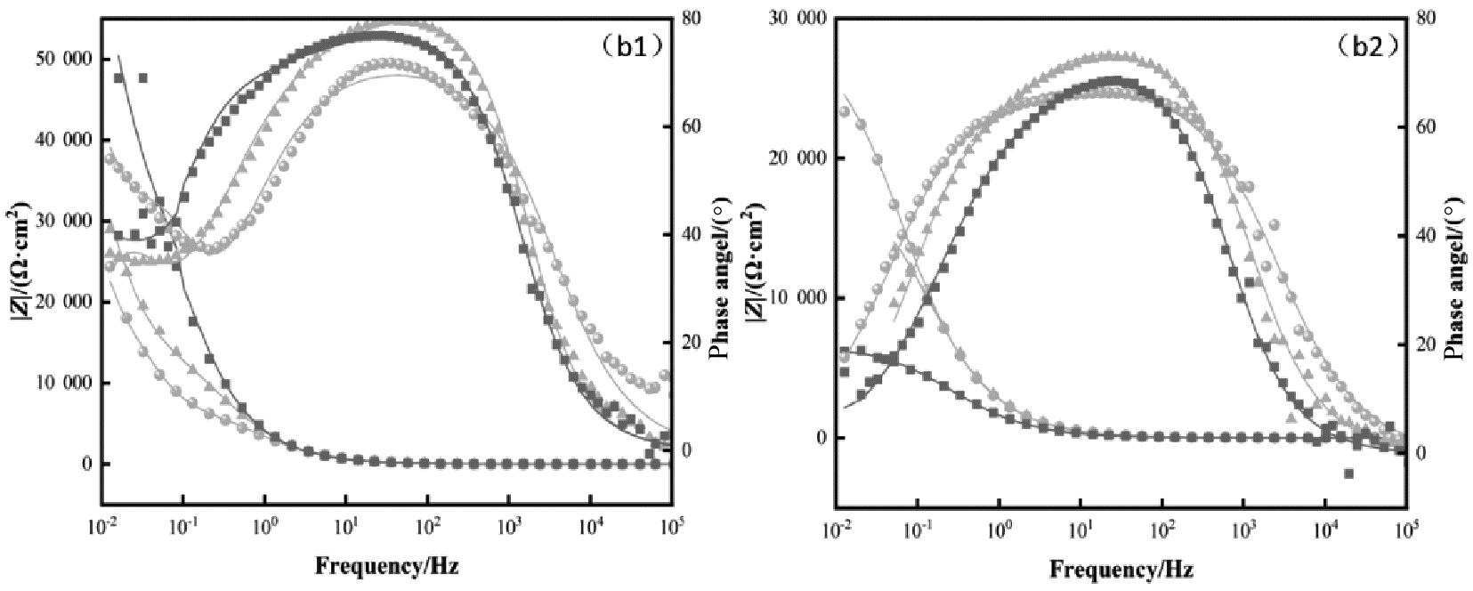 (a1)-(a2) Nyquist plot of 3.5% NaCl solution and 3.5% NaCl+0.01 mol/L NaOH solution; (b1)-(b2) bode plot of 3.5% NaCl solution and 3.5% NaCl+0.01 mol/L NaOH solution