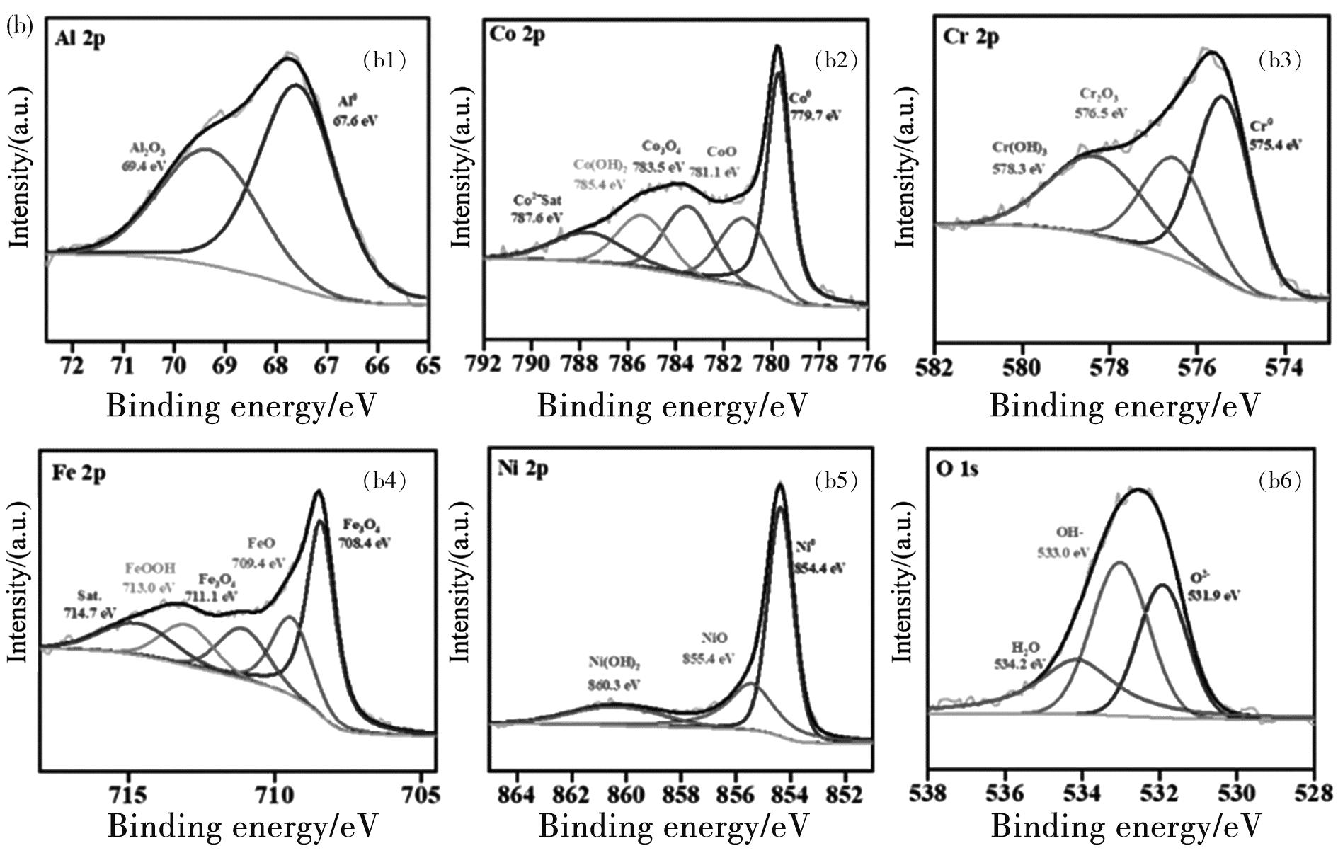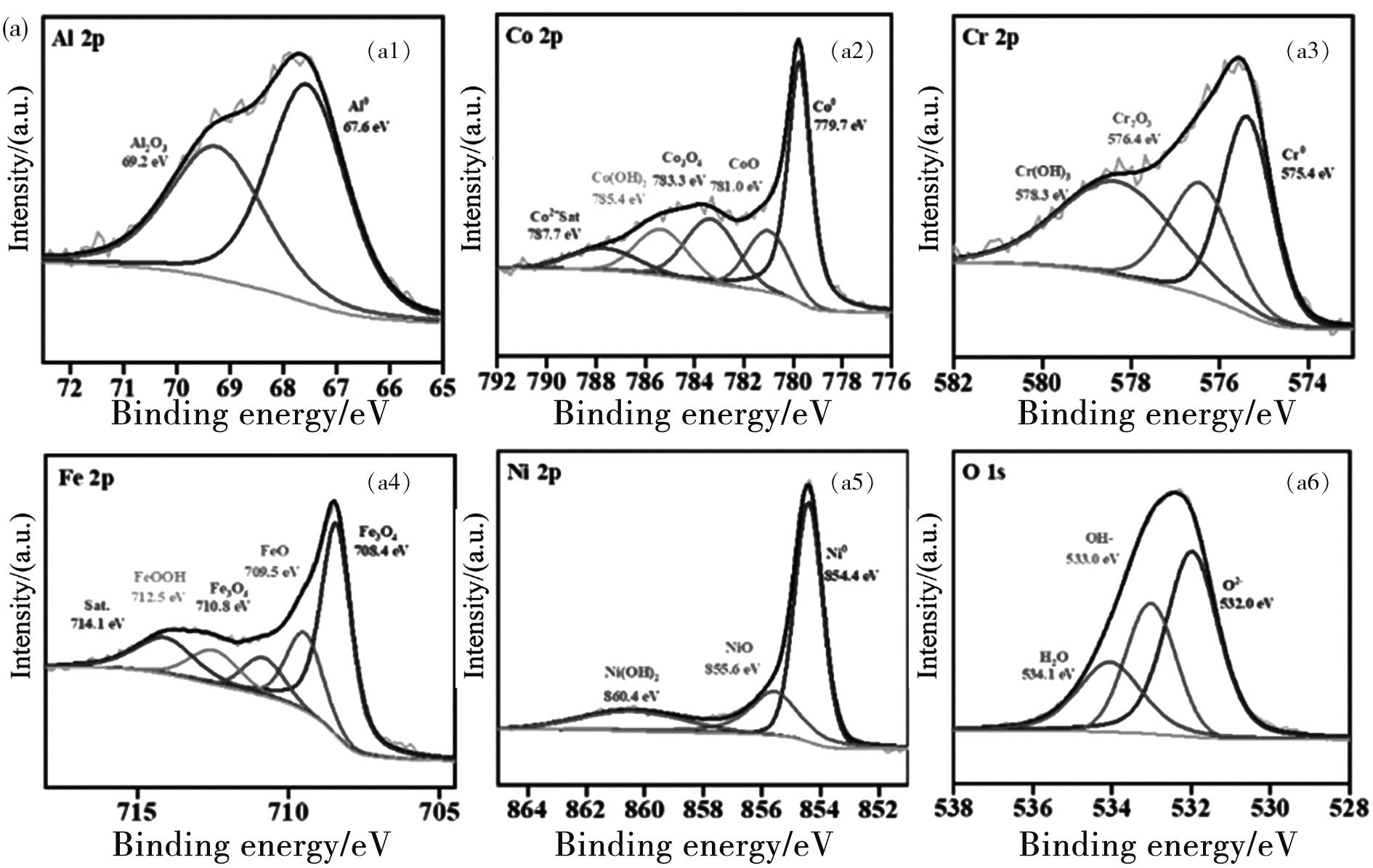 为了进一步分析不同温度下形成的钝化膜和腐蚀产物膜对合金涂层腐蚀行为的影响,通过XPS对AlCoCrFeNi2.1的表面组成进行分析,图6和图7分别显示了AlCoCrFeNi2.1高熵合金不同温度下在3.5%NaCl溶液和3.5%NaCl+0.01mol/L NaOH溶液中浸泡后的钝化膜的XPS分析图,其中钝化膜中包括了Al 2p, Co 2p3/2, Cr 2p3/2, Fe 2p3/2, Ni 2p3/2, 和 O 1s。