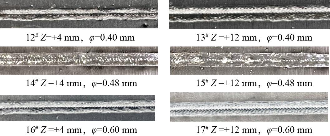 =0.6 mm时,在+4 mm和+12 mm离焦量下均能获得良好成形。这说明较大的激光焦斑直径有助于改善焊接过程的稳定性,减小飞溅,获得更优焊缝质量。但总体而言,采用三种不同焦斑直径焊接均是离焦量为+12 mm时成形焊缝质量最优。