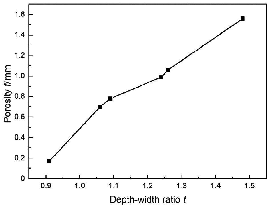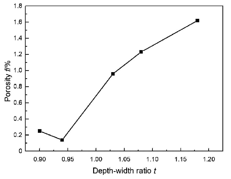 在TC4钛合金试板非穿透型激光焊接过程中,便可通过调整工艺参数及光学配置扩大小孔直径,提高焊接过程中小孔的稳定性,抑制小孔产生周期性地闭合,有利于改善熔池中的气孔缺陷[17]。与此同时,适当降低熔池的深度,增加熔池的宽度,使得熔池内的气体逃逸通道变短、变宽,也有助于熔池内的气体逃逸,从而降低熔池凝固后焊缝内的气孔率。