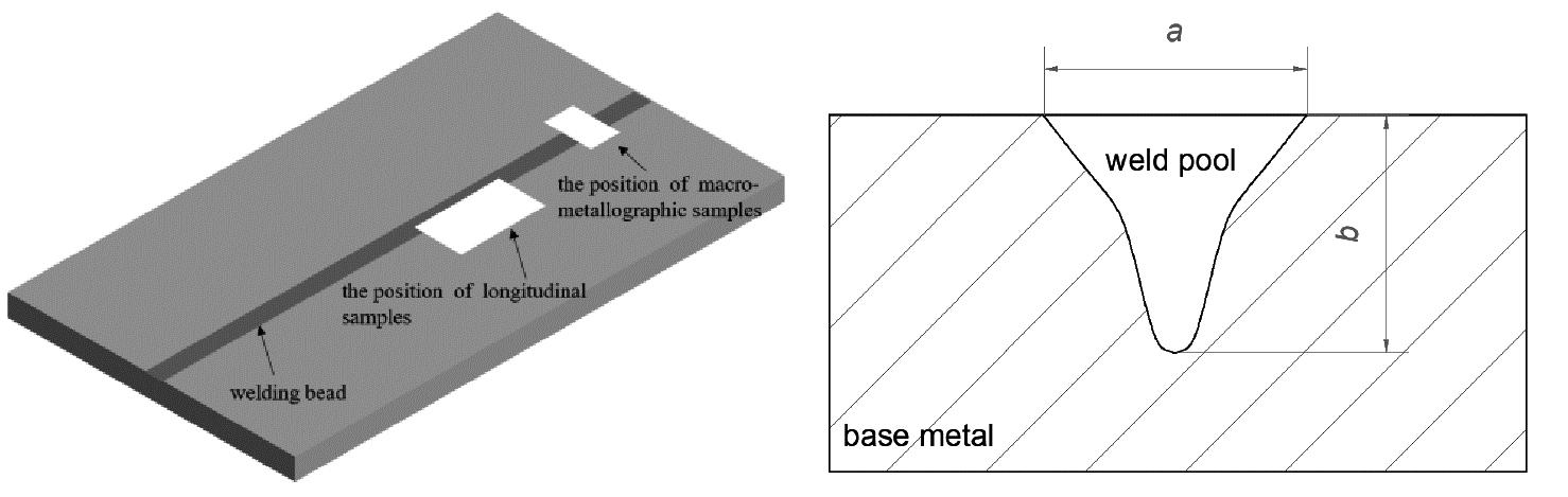 采用电火花线切割机在每组焊缝中心位置取宏观金相样及纵向气孔样,制样后测量焊缝熔深及熔宽,通过焊缝t值(深宽比),结合各焊缝中心处的气孔数量来分析气孔规律。纵向气孔样长度统一为40 mm,气孔样研磨到焊缝中心后观察气孔情况,试样取样位置如图3所示。同时,为更好地研究各工艺参数对焊缝质量的影响,定义焊缝熔深b和熔宽a的比值为t,并使用 Image Pro软件对照片上的气孔面积与焊缝面积信息进行采集与统计。本文将焊缝气孔投影总面积与焊缝投影面积的比值作为气孔率,计算公式为:
