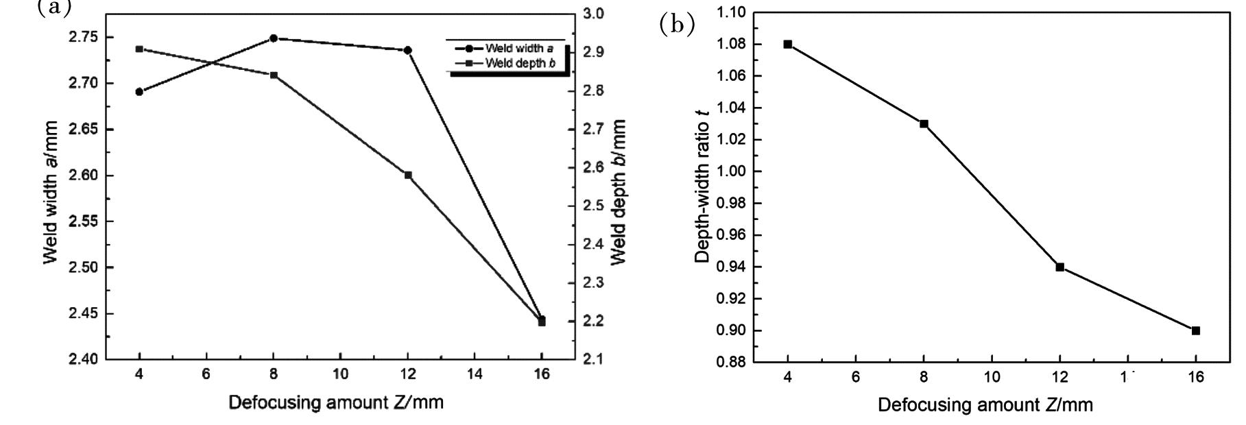 (a)Effect of defocusing amount on weld width,depth;(b)effect of defocusing amount on depth-width ratio