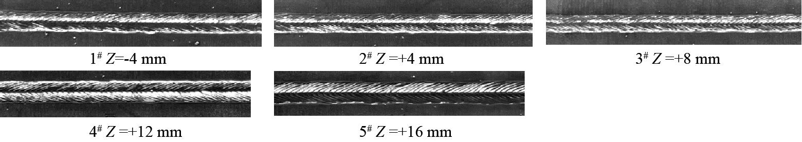 采用焦斑直径0.48 mm的光学配置进行焊接实验,实验中固定激光功率为2 100 W,焊接速度为25 mm/s,根据单一变量法在不同离焦量下的焊缝宏观形貌如图4所示。由图4可知,离焦量Z在-4~+16 mm范围内变化时,焊缝均能获得较好成形,但离焦量Z在+12~+16 mm区间成形焊缝的宏观形貌更为圆滑均匀。与此同时,离焦量Z为+4 mm比Z为-4 mm焊接过程中产生的飞溅更多。这是因为负离焦时激光焦斑位于匙孔内,匙孔内的能量密度更高,熔池反应更剧烈。