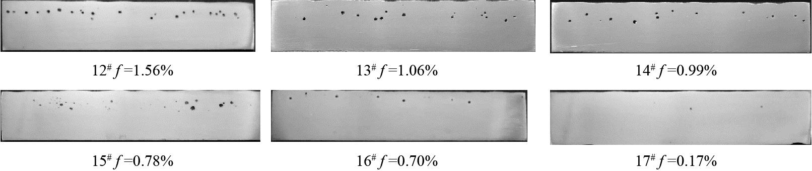 不同激光功率下成形焊缝的内部气孔状态和气孔率分别如图12和图13所示。由图12可知,离焦量为+12 mm/+16 mm一定时,随着激光功率的逐渐增加,焊缝t值均逐渐增大,焊缝气孔率也呈逐渐增多趋势。由气孔率的统计结果发现,当焊缝t值控制在0.9左右时,焊缝中心处的气孔率显著降低。由于焊缝t值降低,焊缝熔宽增加,熔深降低,匙孔通道变短,较浅的熔池深度更有利于焊缝中的气体逃逸。