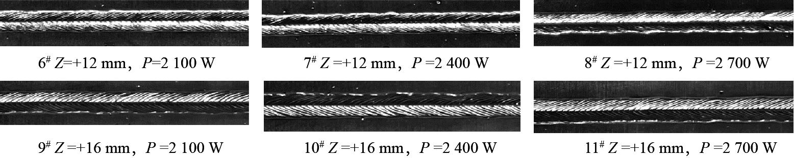 根据前述离焦量实验可知,采用较大离焦量有助于改善焊缝成形及控制焊缝内部气孔率。因此本节实验参数采用离焦量Z=+12 mm/+16 mm,焦斑直径0.48 mm,固定焊接速度为25 mm/s,实验中根据单一变量法在不同激光功率下进行焊接实验。成形焊缝的宏观形貌如图9所示。由图9可知,离焦量Z=+12 mm/+16 mm,激光功率P从2 100 W增大到2 700 W范围内变化时,焊缝均能获得较好成形。