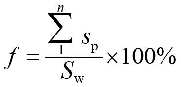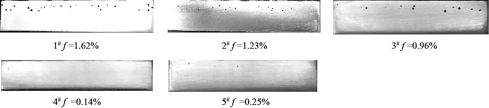 式中:f为焊缝气孔率,%; Sp为单个气孔的投影面积,mm2;Sw为焊缝投影面积,mm2;t为焊缝深宽比值;a为焊缝熔宽,mm;b为焊缝熔深,mm。