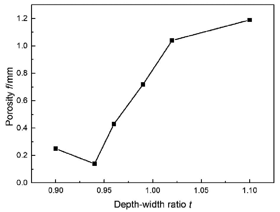 不同离焦量下成形焊缝的内部气孔状态和气孔率如图7和图8所示。由图7可知,随着焊缝t值的逐渐增大,焊缝气孔率也呈逐渐增多趋势。由气孔率的统计曲线发现,当焊缝t值控制在0.9左右时,焊缝中心处的气孔率显著减低。由于焊缝t值降低,焊缝熔宽增加,熔深降低,匙孔通道变短,较大的离焦量使得焊接过程中的匙孔直径变大,匙孔稳定性有所提高,且较大的匙孔直径更有利于焊缝中的气体逃逸。