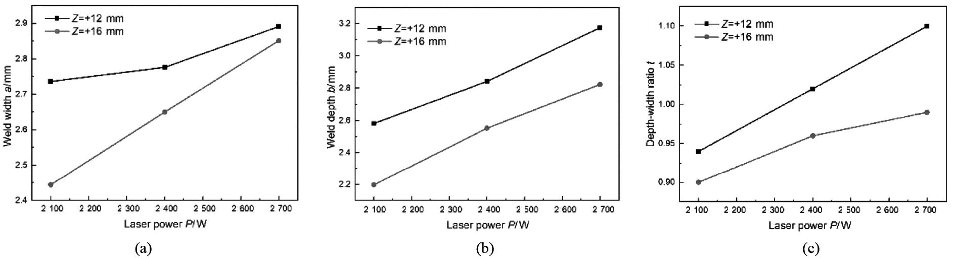 (a)Effect of laser power onweld width; (b)effect of laser power on weld depth; (c)effect of laser power on depth-width ratio