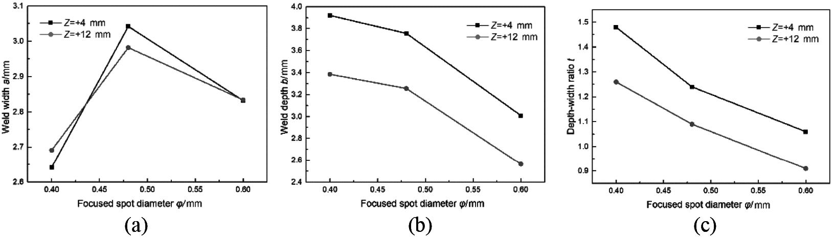 (a)Influence of focused spot diameter on weld width; (b)influence of focused spot diameter on weld depth; (c)influence of focused spot diameter on depth-width ratio