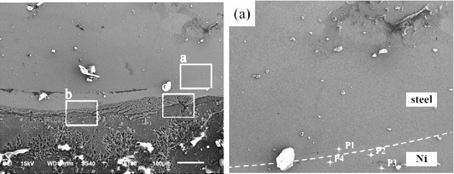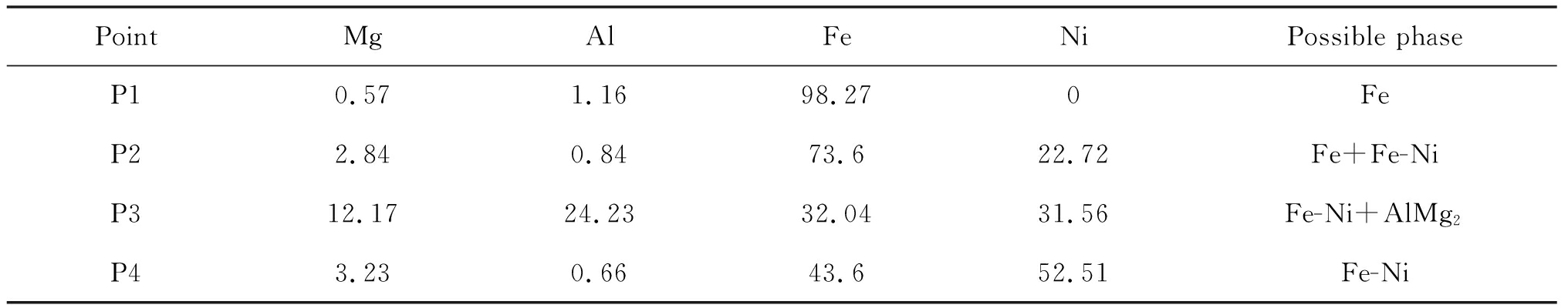 图9(a)为钢侧焊缝Fe-Ni连接界面,为了验证Fe-Ni两种材料之间是否生成固溶体或者发生反应形成金属间化合物,排除纯机械连接的可能,对界面处进行EDS分析,分析结果见表2。EDS点扫描结果表明,点P1的原子组成为0.57%Mg、1.16%Al、98.26%Fe、0%Ni,故推测点P1处应为钢基体。点P2的原子组成为2.84%Mg、0.84%Al、73.60 %Fe、22.72%Ni,故推测P2区域为Fe+Fe-Ni固溶体。点P3的原子组成为12.17%Mg、24.23%Al、32.04 %Fe、31.56%Ni,故推测点P3的成分为Fe-Ni和AlMg2化合物。点P4的原子组成为3.23%Mg、0.66%Al、43.60%Fe、52.51%Ni。故推测点P4位置为Fe-Ni固溶体。观察图9(a)可以看到,在Fe-Ni结合界面,有一条明显的轮廓线,根据点P1和点P2的EDS分析结果可知,上层颜色较深的区域是钢母材,下层颜色较浅的区域是Fe-Ni固溶体组成。在激光作用下,在焊缝中心区域Ni箔中的Ni原子与熔化的Fe原子无限固溶形成Fe-Ni固溶体。