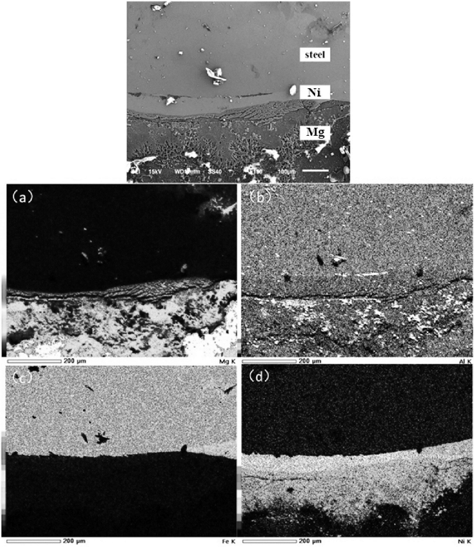 对添加Ni箔的镁/钢焊接接头界面处进行EDS面扫,分析焊接接头元素分布和熔合情况,主要分析Fe、Mg、Al、Ni 4种元素,图10为镁/钢激光焊接焊缝中心区域面扫描图。面扫描越亮的地方代表此处对应元素含量高。图10中(a)、(b)、(c)、(d)分别为Mg、Al、Fe、Ni 4种元素分布图,Al元素在焊缝中心处富集,形成了Al-Ni化合物。可以看出反应层主要是Fe、Ni、Mg三种元素,在激光焊接的搅拌作用下钢侧焊缝Fe元素与Ni元素相互扩散生成Fe-Ni固溶体,Mg元素由于浮力向上扩散,Ni元素向下扩散,在镁侧焊缝生成Mg2Ni、MgNi2等化合物,与前文所推测的结果一致。