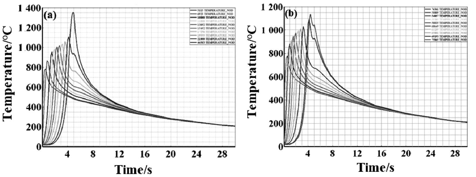 为分析镁侧上表面热循环的影响,在镁合金板上每隔3 mm取一个点,提取其热循环曲线,如图5所示。可以看出激光加工过程是一个温度快速上升,又快速下降的过程,且随着焊接的进行,各点的最高温度逐渐升高。因为在焊接初始阶段,没有足够时间来吸收激光能量,随着焊接的进行,后一个点由于热传导吸收前一个点传递的能量,造成热量叠加,使温度上升。激光焊接结束后最高点的温度开始急剧下降,在大约15 s后温度趋于一致。镁板未添加Ni箔最高温度约为1 360 ℃,添加Ni箔后最高温度约为1 160 ℃,温度梯度减缓,说明Ni箔起到一定的隔热作用。