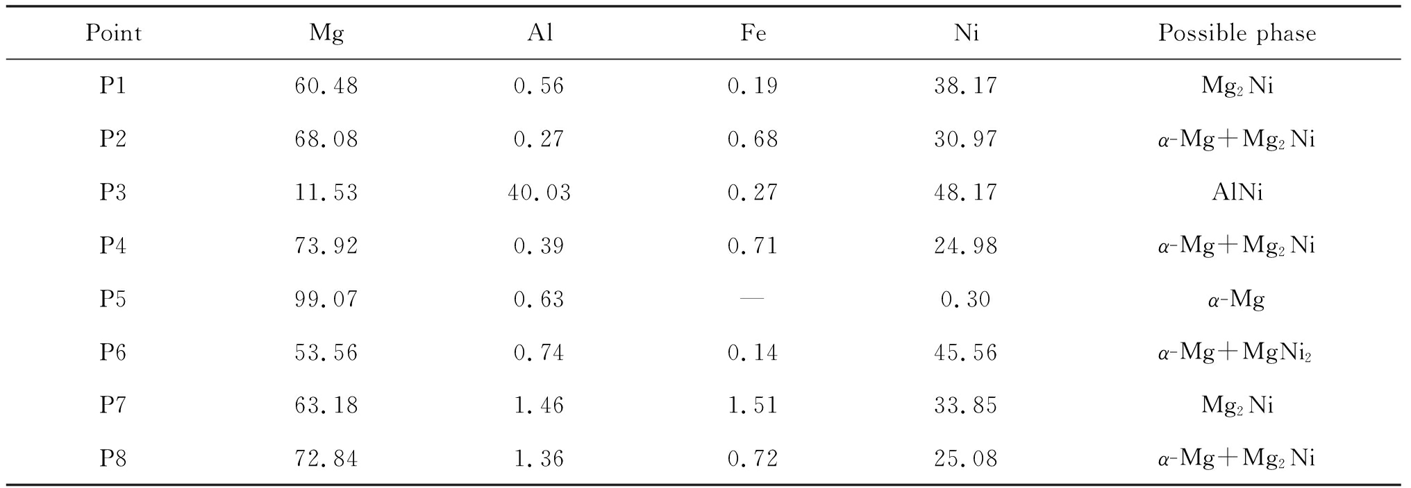 PointMgAlFeNiPossiblephaseP160.480.560.1938.17Mg2NiP268.080.270.6830.97α-Mg+Mg2NiP311.5340.030.2748.17AlNiP473.920.390.7124.98α-Mg+Mg2NiP599.070.63—0.30α-MgP653.560.740.1445.56α-Mg+MgNi2P763.181.461.5133.85Mg2NiP872.841.360.7225.08α-Mg+Mg2Ni