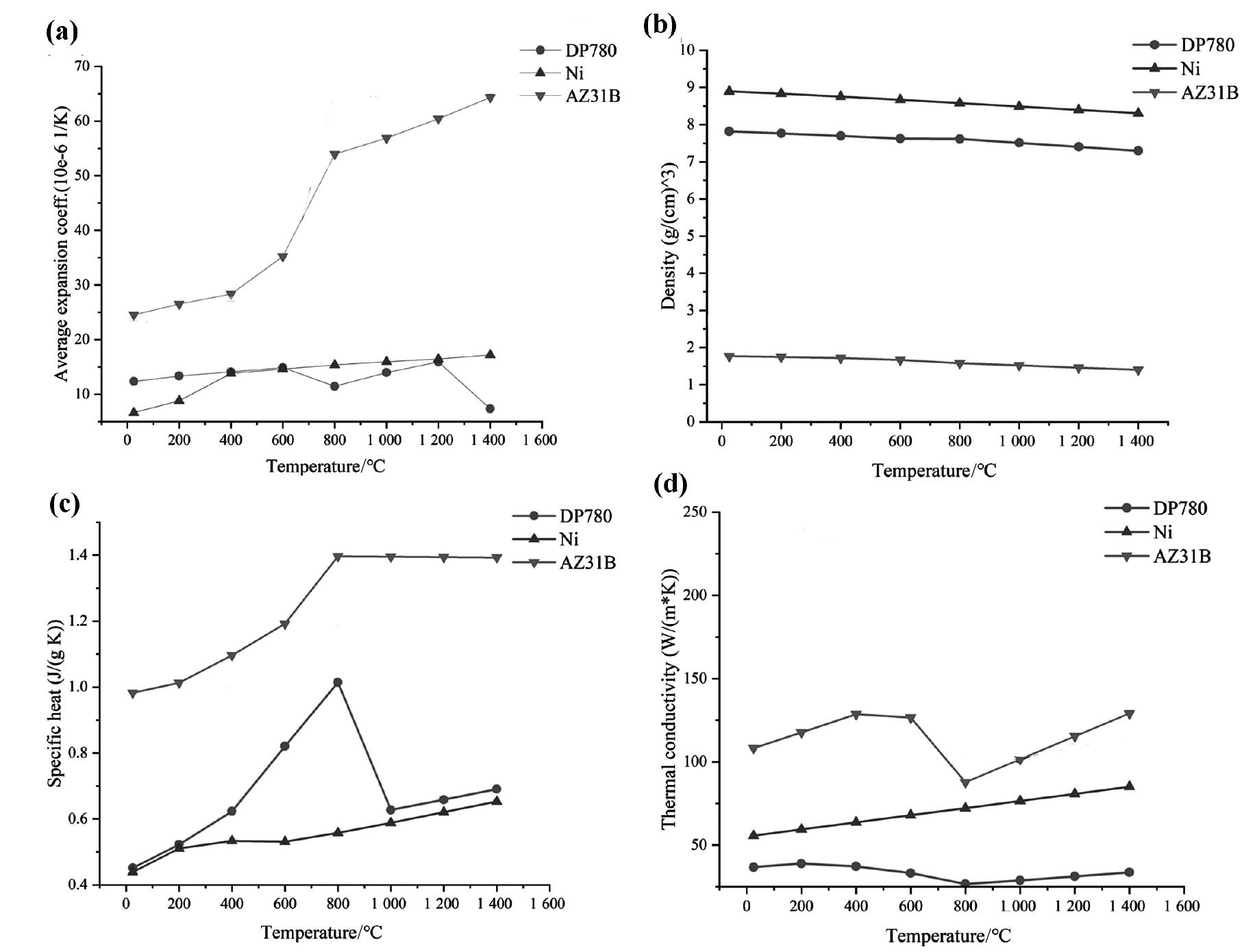 对于常见的焊接材料,可以直接在SYSWELD自带材料库中调用,本实验中采用的材料无法从SYSWELD本身自带的材料库中调用,因此本实验所需材料的热物理性能参数采用Jmatppro7.0软件根据材料成分计算出所需材料的热物理性能,包括导热系数、密度、比热容以及热导率。得到的AZ31B镁合金、DP780双相钢和Ni箔的材料热物理性能参数随温度变化的曲线如图2所示,在Visual Weld中Material Database模块对所需要的材料进行二次开发。