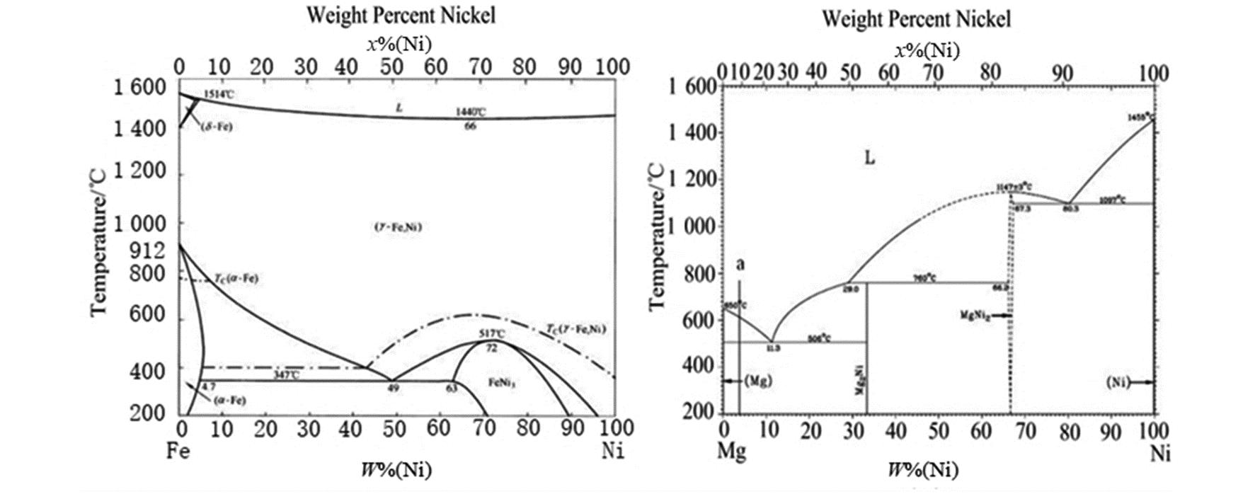 (a) Phase diagram of Fe-Ni binary alloys;(b) phase diagram of Mg-Ni binary alloys