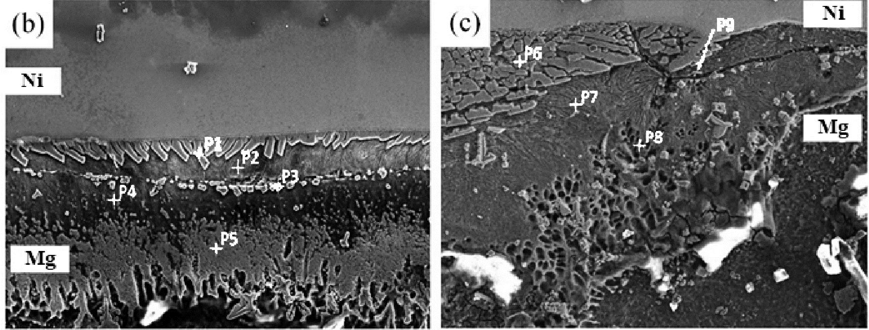 图9(b)和9(c)为镁侧焊缝Mg-Ni连接界面,为了验证预置中间层Ni箔对界面反应有何作用,以及Mg-Ni两种材料之间发生反应生成的金属间化合物,对界面处进行EDS分析,分析结果见表3。图9(b)中,在靠近Ni箔的区域主要由锯齿型块状和明白色颗粒形状组成,在镁熔池的中部区域由深色部分和分散的四边形结构组成,在扫描电镜条件下可以看到树枝状和粒状的组织形貌,在图9(c)中区存在大面积的网格状颜色较深的组织紧密相连,为确定界面和焊缝中新生成相的组成,对图中标记位置进行EDS点扫描分析,扫描结果见表3所示。根据EDS点扫描结果表明,点P1的原子占比为60.48%Mg、0.56%Al、0.19%Fe、38.75%Ni,点P2的原子占比为68.20%Mg、0.27%Al、0.68%Fe、30.78%Ni,因此推测P1和P2应为MgNi2。在激光焊接过程中部分熔化的Ni层和熔化的镁层形成焊接熔池,在靠近Ni箔的熔池富Ni部分随着熔池温度降低,发生L→Mg2Ni的转变,形成锯齿状的Mg2Ni。在靠近镁侧的富镁区发生L→Mg2Ni的转变,形成明亮的分散颗粒。继续向下进行点扫,P3点的原子占比为11.53%Mg、40.01%Al、0.20%Fe、48.17%Ni,P4点的原子占比为73.92%Mg、0.39%Al、0.71%Fe、24.97%Ni,根据其化学成分特点,P8点原子组成与P4点相似,故推测P3点主要成分为AlNi,P4和P8点主要成分为α-Mg+Mg2Ni,随着熔池温度的降低,α-Mg首先析出并富集,随着温度继续降低在靠近镁侧的富镁区发生L→Mg2Ni的转变,在液体中析出Mg2Ni(L→Mg2Ni),Al等其他元素被集中,生成了AlNi相。继续向下进行EDS点扫,P5点的原子占比为98.96%Mg、0.63%Al、0%Fe、0.30%Ni,根据Ⅵ点的EDS结果推测其为α-Mg组织。从图9(c)点扫描结果可以看出,越远离Ni箔,Mg原子含量越多而Ni原子含量越来越少,故推测从P6点到P8点,焊缝组织由α-Mg+MgNi2向α-Mg+Mg2Ni转变[21]。