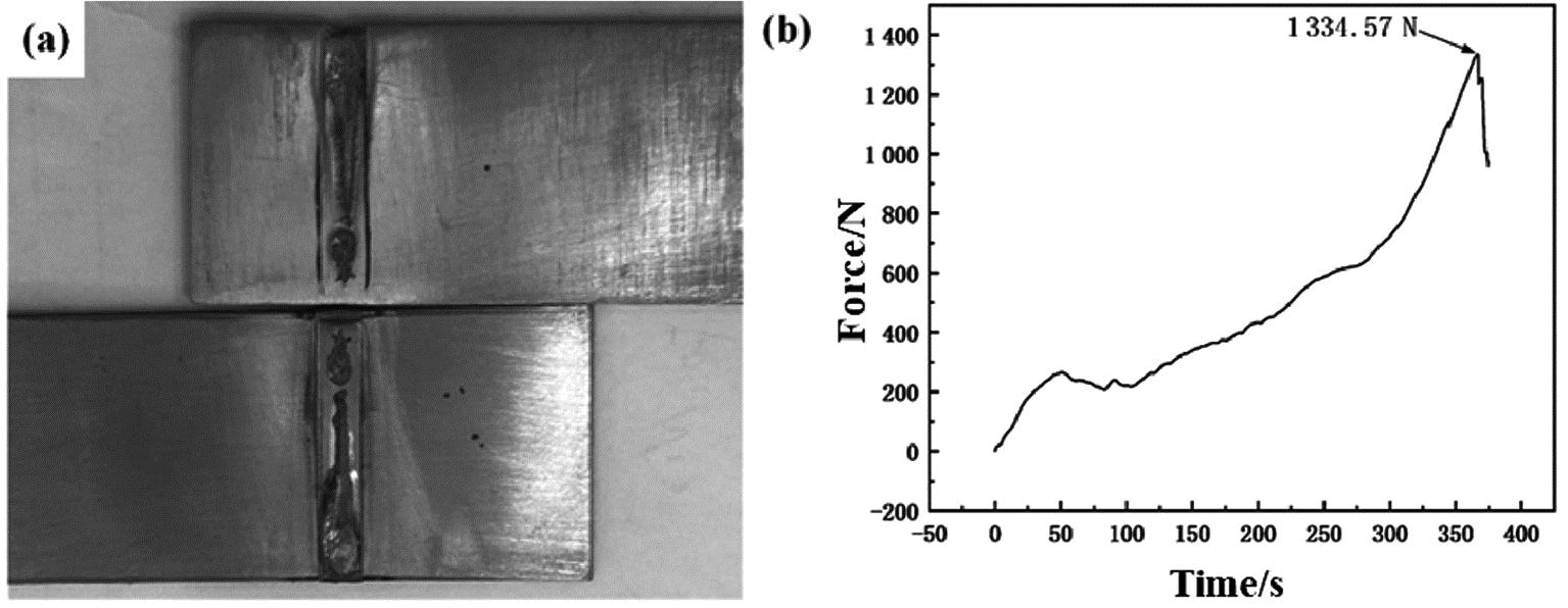 在不添加中间层时,由于镁/钢之间的巨大物理性能和化学性能的差异,镁/钢之间不发生反应且不产生化合物,所以镁/钢直接焊接时,不能获得可靠的焊接接头。在添加中间层Ni箔的情况下,上层Fe与Ni产生固溶体,下层镁合金与Ni生成IMC层,显著提高了接头强度。随着激光功率的不断增大,焊接接头的拉剪强度呈现出先上升后下降的趋势。当激光功率达到1.2 kW时,作用在上层钢板的热量不够,Fe、Ni、Mg 3个元素没有充分的扩散反应,接头实际焊上部分较小,无法承受过高的载荷,拉伸强度仅为44 N/mm。当激光功率增加至1.3 kW,镁/钢激光焊接拉伸断裂后的试样如图11(a)所示,上层钢板和Ni中间层部分熔化,Fe、Ni、Mg元素在长时间的高温情况下充分扩散,使得拉伸强度升高,拉伸应力-应变曲线如图11(b)所示,达到166 N/mm。当功率增加到1.4 kW时,由于镁合金的沸点较低,部分镁合金蒸发变成镁蒸气,焊缝烧损严重,出现大量飞溅,接头拉伸强度大幅度下降,拉伸强度仅为38 N/mm。