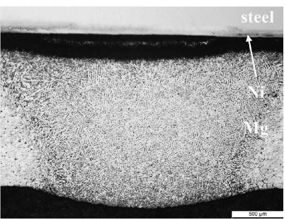 图8是在激光功率P=1.3 kW,焊接速度v=6 mm/s,预置中间层Ni箔厚度D=0.1 mm,离焦量Δf=15 mm,保护气流量为15 L/min的工艺参数条件下,镁/钢激光焊接接头横截面形貌,上板为DP780双相钢板,下层是AZ31B镁合金,紧挨着中夹层Ni箔的上层钢板并未完全熔化,而下层镁合金板由于热量的传导熔化,观察到镁侧熔池呈半球形。熔化的镁合金在冷却后经历了再结晶过程。根据焊接冶金学原理,在凝固过程中,α-Mg相会沿着熔池中最大温度梯度的方向进行反向生长。也就是说,α-Mg相会垂直于熔合线向焊缝中心生长,形成排列整齐的柱状晶体结构。