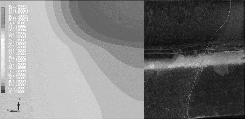 图3 模拟仿真温度场分布图云图与实际焊缝截面对比图