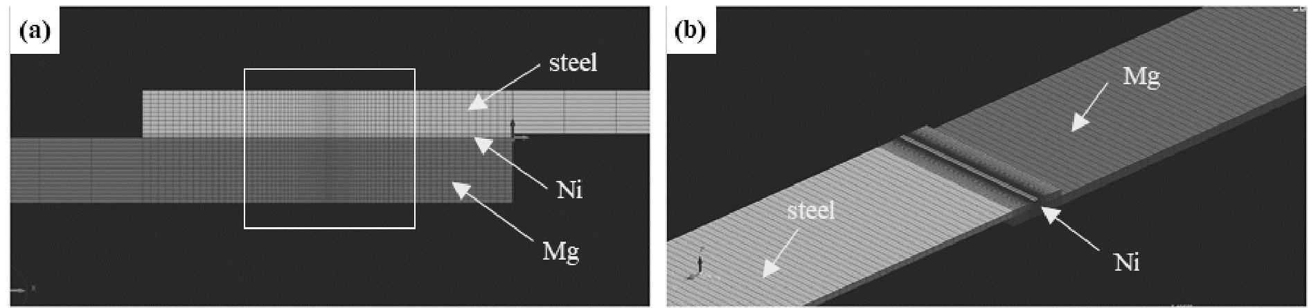 在进行仿真计算时,采用的AZ31B镁合金尺寸为100 mm×30 mm×1.5 mm,DP780双相钢尺寸为100 mm×30 mm×1 mm,为了兼顾模拟计算的准确性和计算速度,采用非均匀的网格划分,焊缝及其附近区域由于存在较大的温度梯度,如图1(a)中p区域所示,网格应尽可能细密,远离焊缝母材温度梯度较小,网格相应划分稀疏,本次实验所画网格如图1(a)、(b)所示[16]。