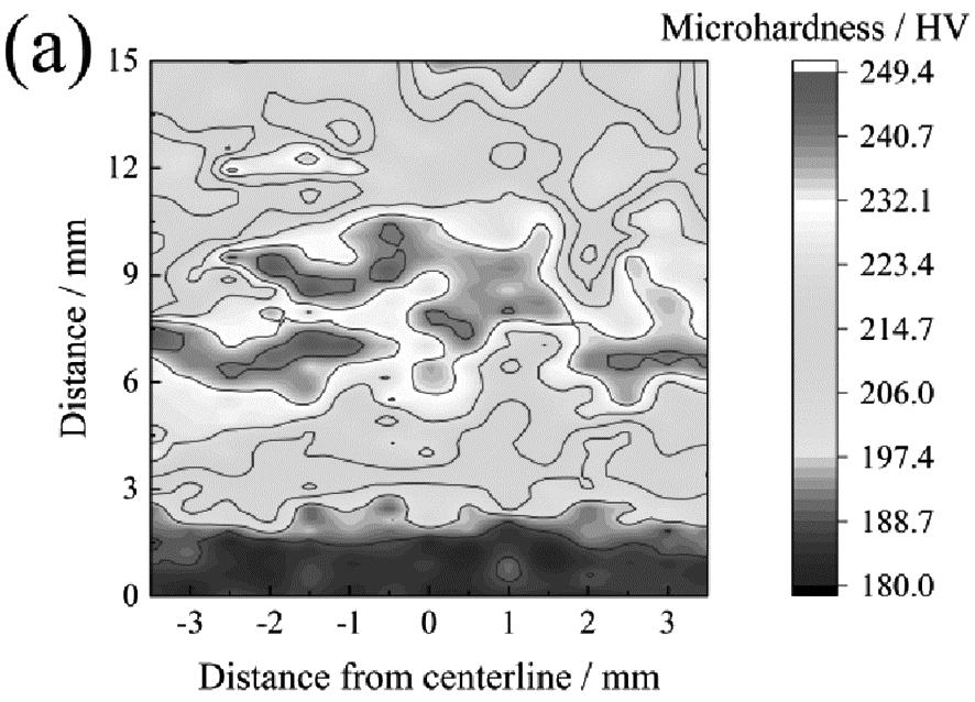 图10为三组不同路径沉积试件的显微硬度分布图。其中图10(a)为单向平行试件,显微硬度值从顶部向下先逐渐增大,后逐渐减小再趋于稳定。结合横截面形貌可知,显微硬度最大值分布在沉积层与基板的熔合线附近,约为250 HV,且水平分布情况与熔合边界的锯齿形状类似。图10(b)为往复插补试件,显微硬度值变化趋势与单向平行试件一致,但最大值较高,约为260 HV,且水平分布并不连续。图10(c)为十字交叉试件,显微硬度变化趋势一致,先增大、再减小、后趋于稳定,但最大值的水平分布情况上有较大差别,十字交叉试件显微硬度最大值位于同一水平线上。分析认为,熔合区以下为基板上的热影响区,该区域内经历了不断循环的热处理,导致显微硬度值上升,但随着距离的增大,影响逐渐变小,直至趋于平稳。沉积层的底部主要由于基板进行散热,散热速度较快,晶粒细小,故显微硬度值较高。随着沉积层数的增加,基板影响效果减弱,散热速度减慢,有利于枝晶生成,故显微硬度值下降。