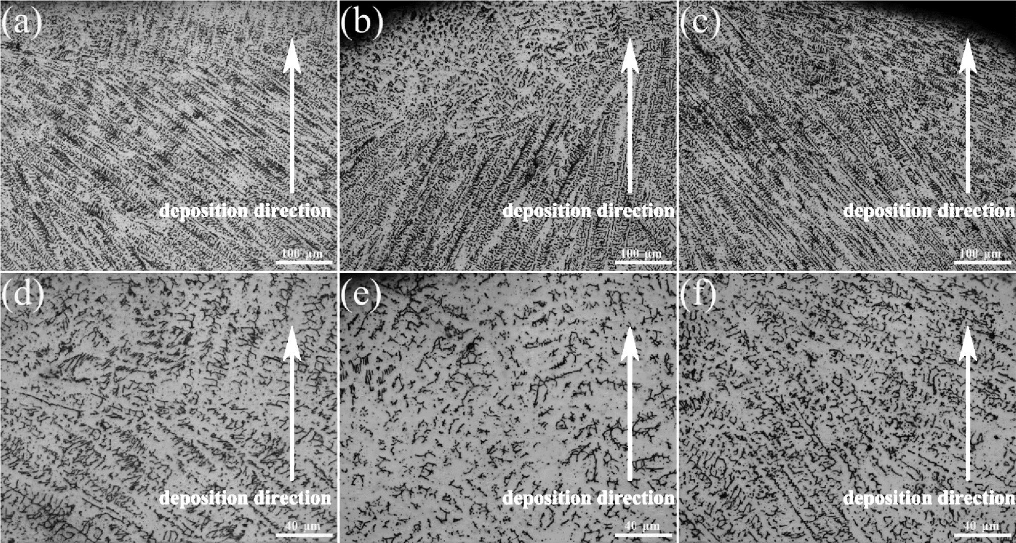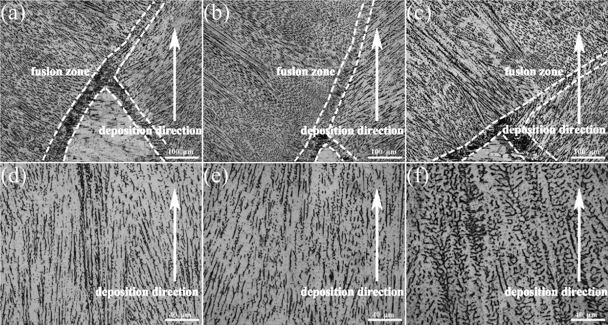 图9为3组不同路径沉积试件的顶部金相组织图像。图9(a)、(d)为单向平行试件的显微组织,由较为明显的柱状枝晶和等轴晶组成,枝晶生长方向出现了明显的向左偏移;图9(b)、(e)和图9(c)、(f)分别为往复插补试件和十字交叉试件的显微组织,也由柱状枝晶和等轴晶组成,但十字交叉试件的枝晶生长方向也向左发生了明显偏移。分析认为,等轴晶区域的形成是由于顶层不再经历热循环作用,而最顶部区域与空气直接接触,借助空气对流进行散热,散热条件发生改变,不再是单一的沉积层,故晶粒沿四周生长,柱状枝晶生长为等轴晶。单向平行和十字交叉试件的柱状枝晶生长方向发生明显的单一方向偏移,是由于同层焊道沉积时提到的相对自由度较大,故熔池内液体流动方向单一。而往复插补的同层焊道沉积过程中,相邻焊道间起到了一定的禁锢作用,故柱状枝晶生长方向向中聚集。