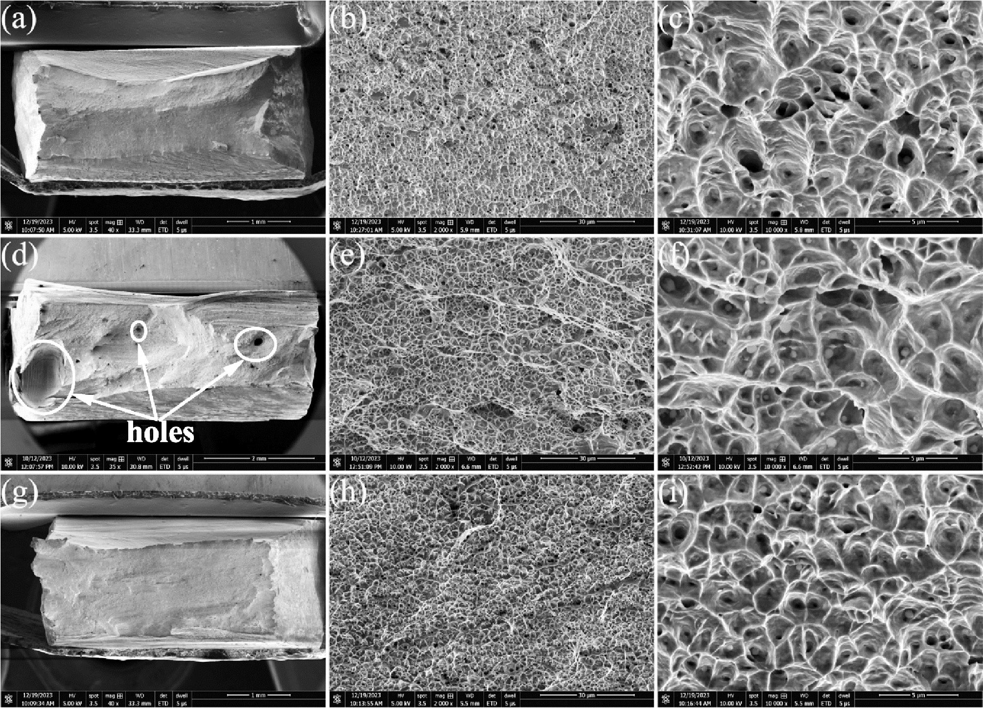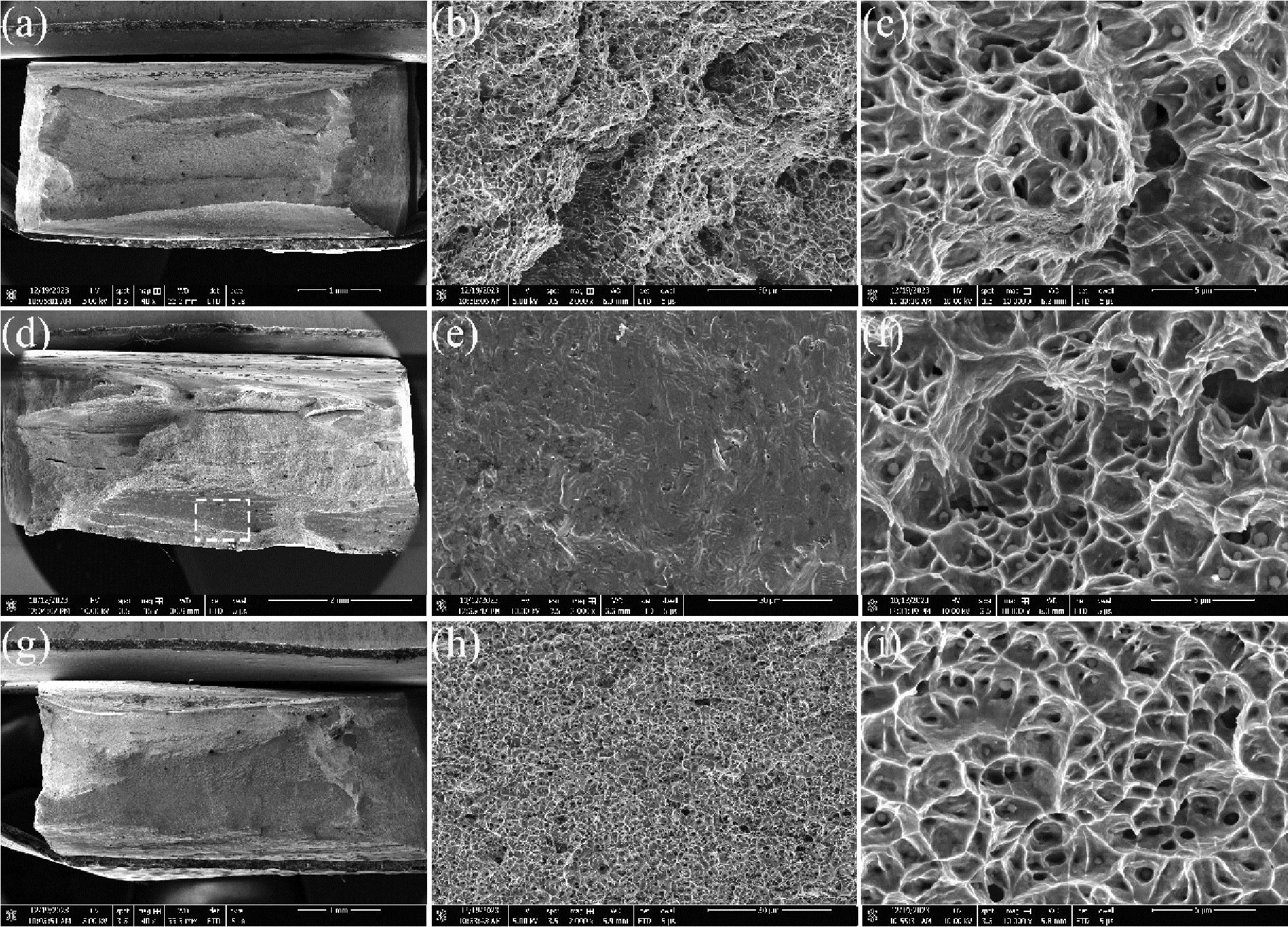 为进一步了解横向试样和纵向试样的断裂机制及差异,通过电子扫描电镜(scanning electron microscope,SEM)进行断口形貌观察。图13分别为3组试件的横向拉伸试样断口形貌,其中图13(a)、(b)、(c)为单向平行试样,可以看到,断口处发生明显的颈缩,且整体断裂方式一致,为典型的韧性断裂;图13(d)、(e)、(f)为往复插补试样,断口表面有较多的气孔缺陷,且存在一个较大的孔洞,严重影响了拉伸性能;图13(g)、(h)、(i)为十字交叉试样,断裂方式与单向平行试样相同,为韧性断裂,但韧窝相对较大,故拉伸性能相对较弱。图14分别为3组试件的纵向拉伸试样断口形貌,其中图14(a)、(b)、(c)为单向平行试样,可以看到,断口表面有少量的气孔缺陷,且撕裂的韧窝具有层次,出现了起皮现象;图14(d)、(e)、(f)为往复插补试样,断口表面仍存在较大缺陷,且断裂方式明显不一致,部分区域出现了解理台阶和解理面,拉伸性能严重下降;图14(g)、(h)、(i)为十字交叉试样,断裂方式为全是韧窝撕裂的韧性断裂,与十字交叉横向试样的断口形貌差异不大。断口表面的SEM图像情况与拉伸性能基本符合,在力学性能上,单向平行试件的横向明显优于纵向,往复插补试件整体较差,十字交叉试件的横向和纵向上表现出一致性。