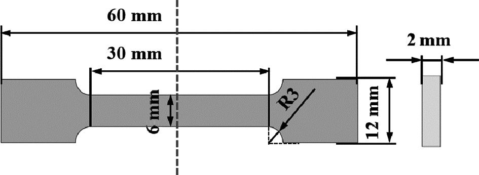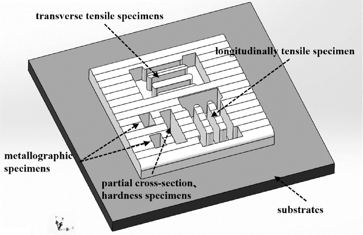 图3为多道多层试件的取样示意图。沿垂直于首层焊道的沉积方向,使用线切割的方式分别取出金相和硬度试样。试样经过240#~3 000#的砂纸打磨、金刚石抛光、王水溶液腐蚀、超声清洗并干燥处理等一系列操作后,将其置于体视显微镜下,经调焦定标后观察焊道横截面的熔合形貌,并在光学显微镜下,观察其微观组织结构。硬度测试以试样顶部最低点为水平线,分别沿水平线平行和以下,每隔0.5 mm测试一个维氏硬度值,最终测试出30×15的硬度点矩阵,从而获得横截面的硬度分布情况。为了测试多单多层试件不同方向上的力学性能,在XOY平面内分别取出平行于X轴的3个横向拉伸试样和垂直于X轴的3个纵向拉伸试样,试样尺寸大小如图4所示。采用电子万能试验机CMT5105,以2 mm/min的速率进行拉伸试验,获取试样的力学性能结果。