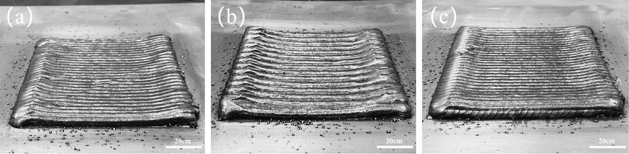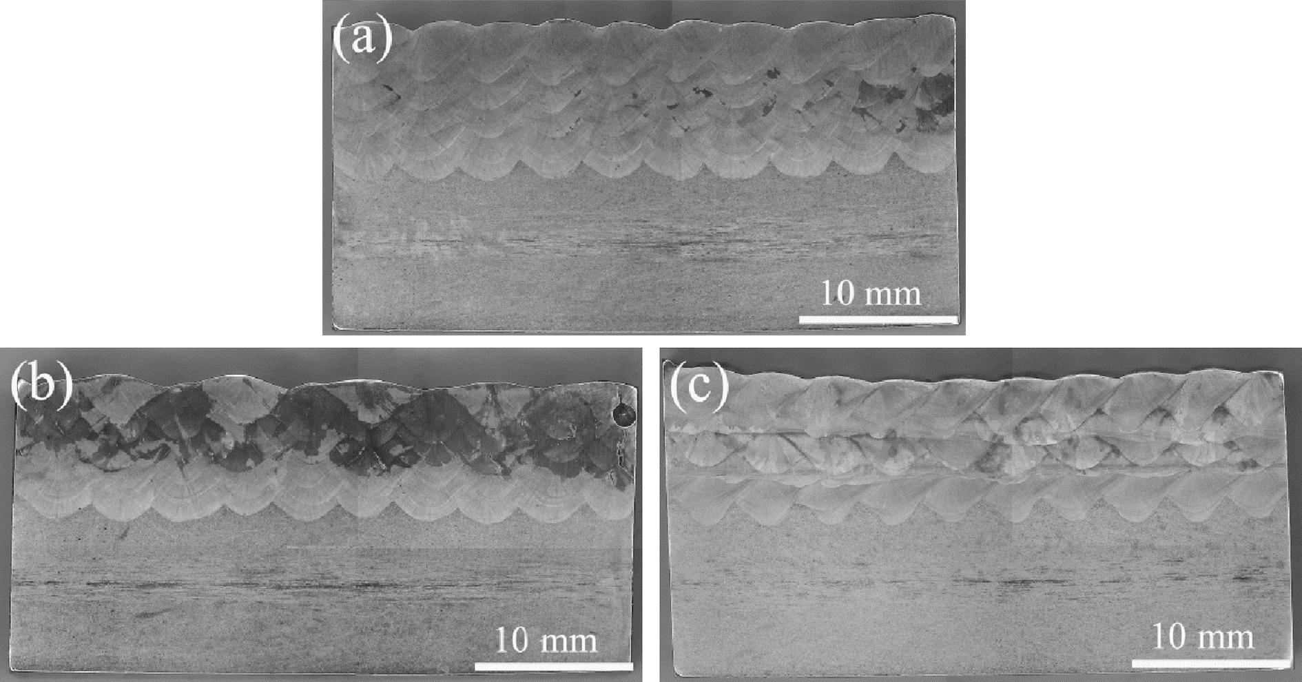 单向平行、往复插补、十字交叉3种沉积路径下成形的多道多层试件宏观形貌如图5所示。可以看到,3组试件任意包含起弧端或息弧端的一侧高度,都明显高于焊道稳定区域,这是电弧增材制造零部件的成形尺寸中一大难点。其中图5(a)为单向平行试件,表面平整度较好,起弧端一侧有金属球滴溢流情况;图5(b)为往复插补试件,奇数焊道和偶数焊道间存在明显的高度差异,尤其是在起弧和息弧两端,焊道两侧也存在明显的溢流情况,且焊道表面也存在裂纹缺陷;图5(c)为十字交叉试件,表面平整度较高,且四周高度差过渡平稳。结合图6的横截面形貌,可以看到,往复插补试件成形质量较差,表面波峰与波谷间间距较大。分析认为,往复插补试件由于奇数焊道和偶数焊道的先后沉积,导致先沉积的焊道对后沉积焊道的金属熔池流动性起到了限制作用,熔池内液体的铺展性受限,导致凝固后形成较高的余高。先后间隔沉积顺序也导致焊道之间存在较高温度差,快速升温和快速冷却容易造成裂纹的出现。而单向平行和十字交叉试件,相邻焊道间陆续沉积,仅一侧受限,相对自由度较大,金属溶液的铺展性较好,有利于减弱相邻焊道间的高度差异。故与往复插补试件相比,单向平行和十字交叉试件的相邻焊道间高度差异较小,表面也较为平整。