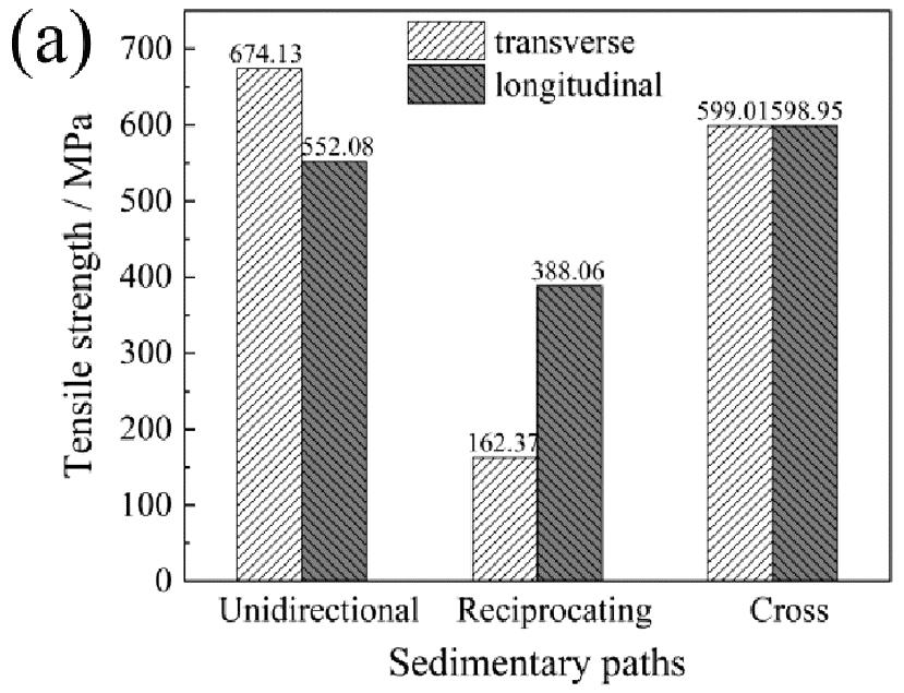 (4)在拉伸性能上,单向平行试件在横向和纵向上表现出各向异性,横向极限承受载荷较高,为674.13 MPa;十字交叉试件在横向和纵向上表现出各向同性,平均抗拉强度分别为599.01 MPa、598.95 MPa,适合增材制造多方受力件;而往复插补试件整体拉伸性能较低,但也在横向和纵向上表现出各向异性。