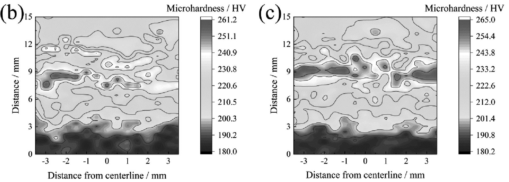 (3)维氏硬度的大体变化趋势相同,从顶部向下,先减小再增大,后快速下降直至趋于稳定,且单向平行试件的显微硬度最大值分布与基板之间的熔合边界有关。