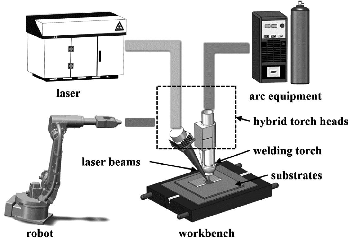 丝材增材制造技术类似于焊接技术,是通过热源熔化焊丝形成焊缝沉积而成,具有极高的沉积效率。其在制造大尺寸金属零部件方面的应用取得了较大突破,但表面成形质量问题一直是关注重点[1]。近年来对丝材增材制造的关注和研究越来越多,该领域具有广阔的发展前景,主要朝着3个方向发展:一是多种热源复合,二是复合材料生产,三是材料的精确成形。复合热源作为三大研究方向之一,诸多研究人员将激光和电弧进行复合增材,将电弧极高的沉积速率与激光尺寸精度高的优势相结合,利用激光作用于电弧弧柱区,压缩电弧,减小电弧的不稳定性,达到优势互补[2-5]。