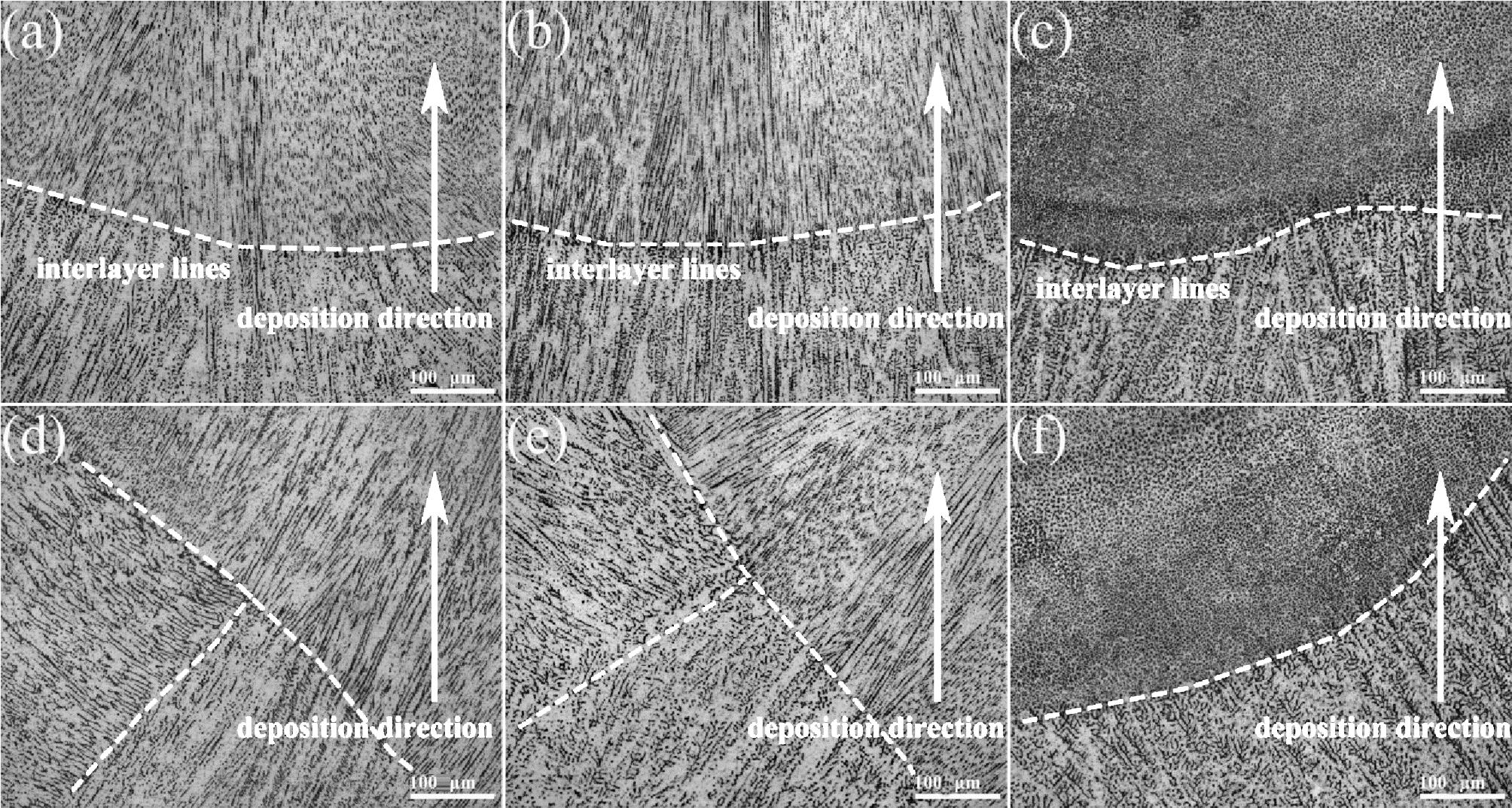 图8为3组不同路径沉积试件的中部金相组织图像,主要为层间和道间的熔合区域。图8(a)、(d)为单向平行试件的显微组织,层间线下方主要发达的柱状枝晶生长,枝晶中心区域有骨骼状δ铁素体,层间线上方存在粒状和条状δ铁素体,部分枝晶穿层生长;图8(b)、(e)为往复插补试件的显微组织,枝晶生长方向更为聚集,且柱状枝晶间距较为密集,条状δ铁素体连接形成了类板条状δ铁素体;图8(c)、(f)为十字交叉试件的显微组织,分层清晰,金相下无明显枝晶穿层生长情况,大量的骨骼状δ铁素体得到保留。分析认为,试件由于不断的热循环,造就了大量热量积累,冷却速度下降,溶质得以有时间扩散,δ铁素体容易析出。单向平行和往复插补的枝晶生长存在穿层现象,是由于金属重熔再冷却凝固时,晶核在下方未重熔的柱状枝晶上形成,导致枝晶穿层,而十字交叉试件,相邻层焊道间相互垂直,导致下层柱状枝晶破碎,本层结晶方向随熔池内液体流动改变,故无明显的枝晶穿层现象。